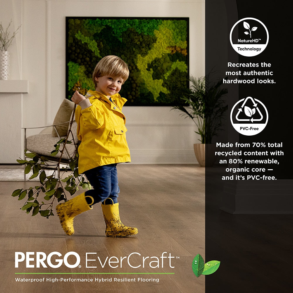 Experience superior durability and an authentic hardwood look with Pergo's Falls Trail Oak Gray Waterproof Hybrid Resilient Flooring. This eco-friendly flooring solution offers 70% recycled content and innovative technologies like WetProtect® and CleanProtect® for waterproof and antimicrobial protection. Perfect for high-moisture areas, this flooring is easy to install and built to last.
