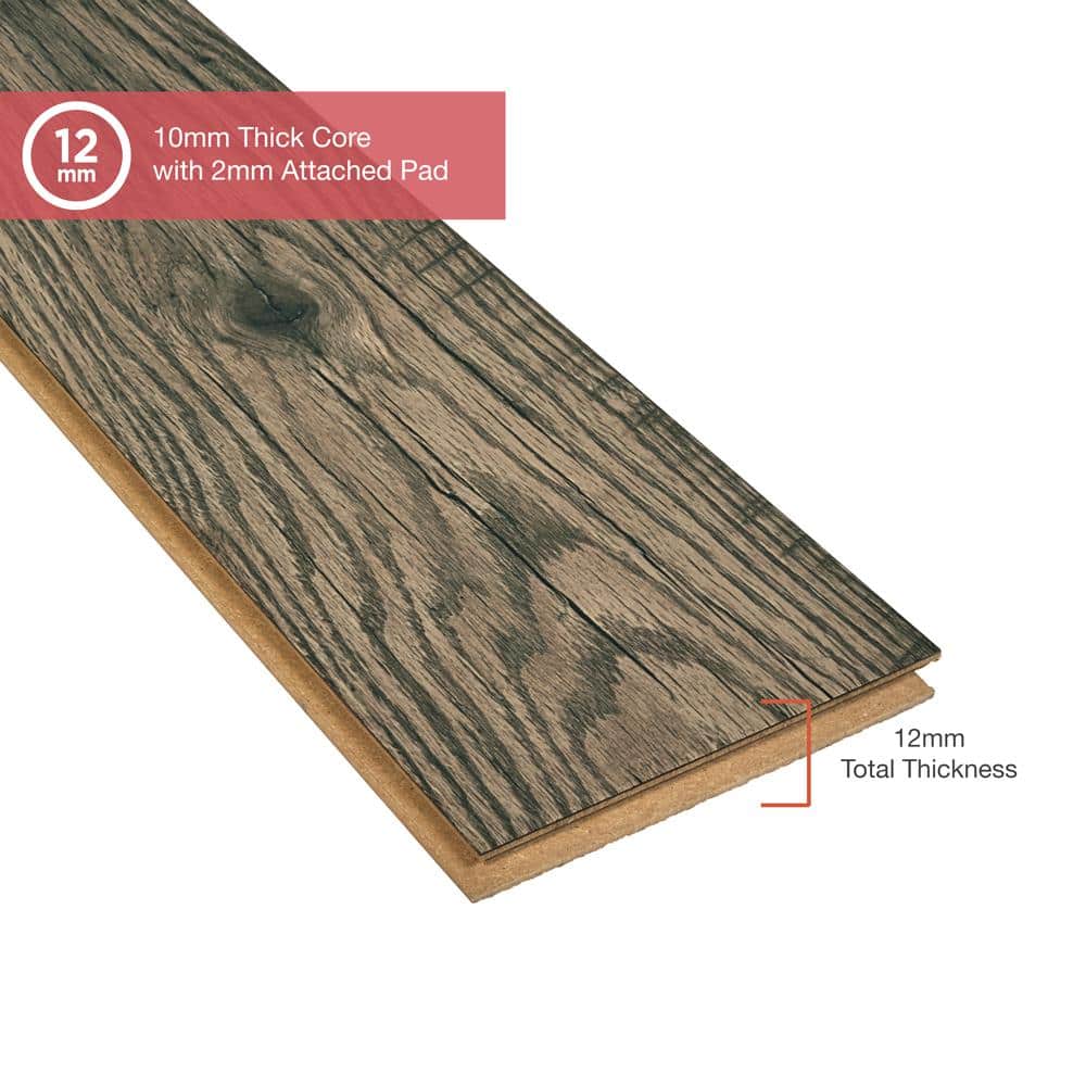 Q: How is this laminate flooring installed? A: This flooring comes with a click lock installation system and attached underlayment, facilitating a quick and easy installation process on a variety of surfaces.
