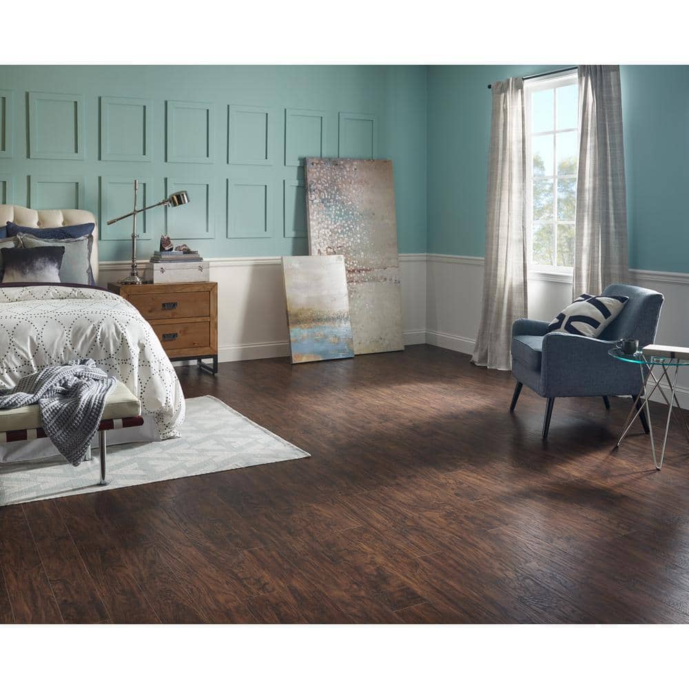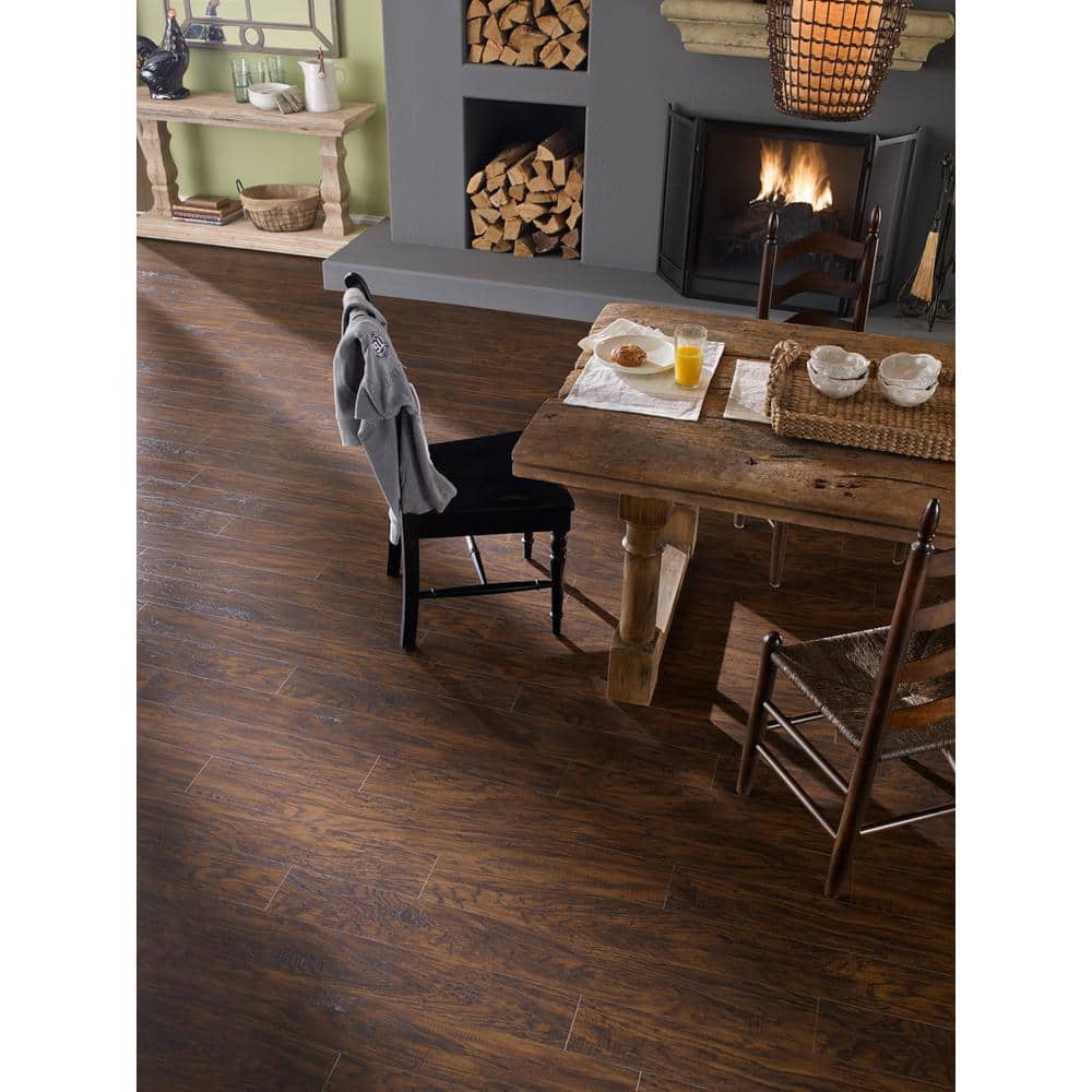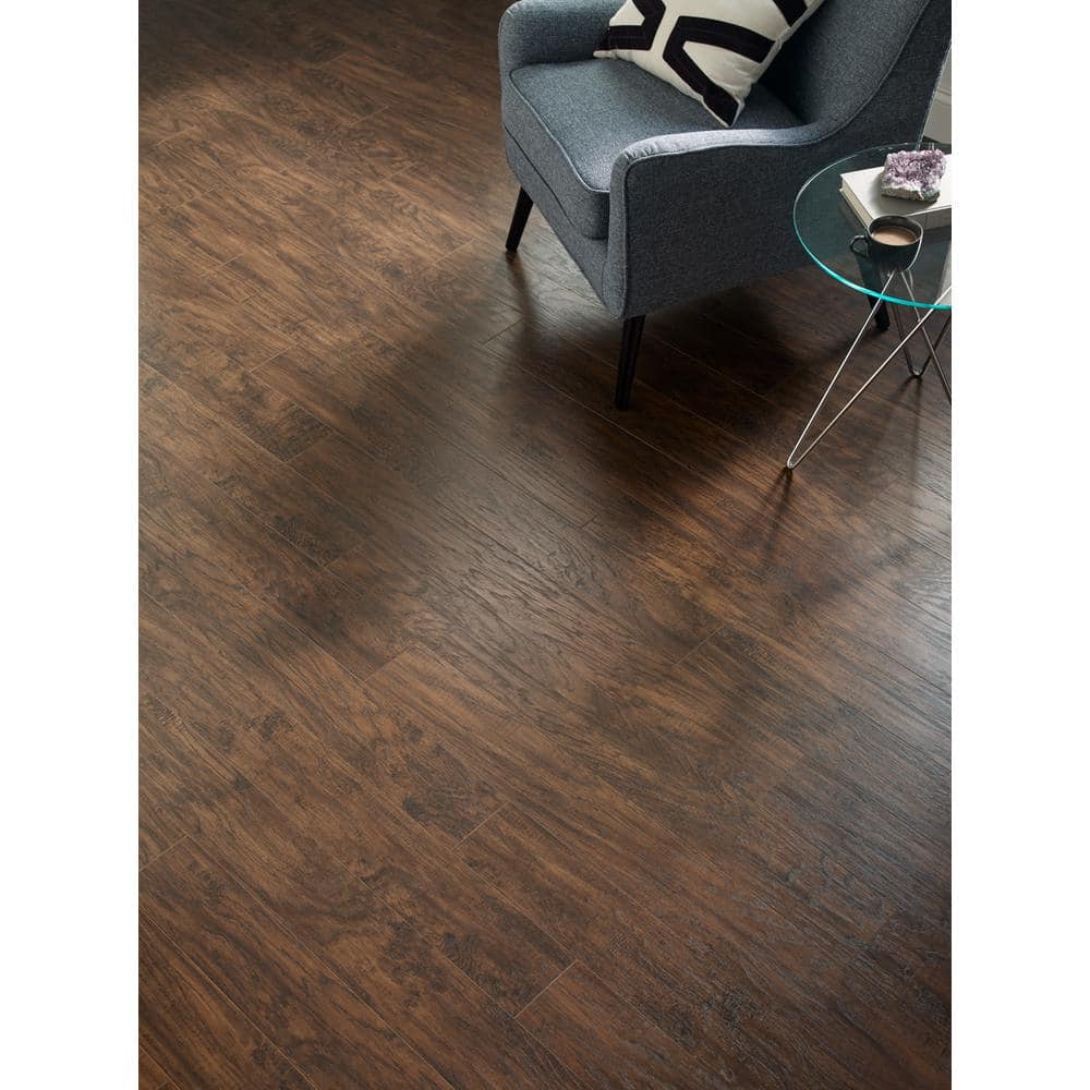 Experience the timeless beauty of hickory with Pergo's XP+ Edgeview Flooring. Its rich, dark palette and natural texture evoke a sense of luxury, transforming any space into a sophisticated retreat. Install it throughout your home for a seamless flow, even extending up the walls to craft a stunning feature piece. This laminate flooring is not just a surface; it is the canvas for your life's masterpiece, combining enduring style with practicality for the discerning eye.