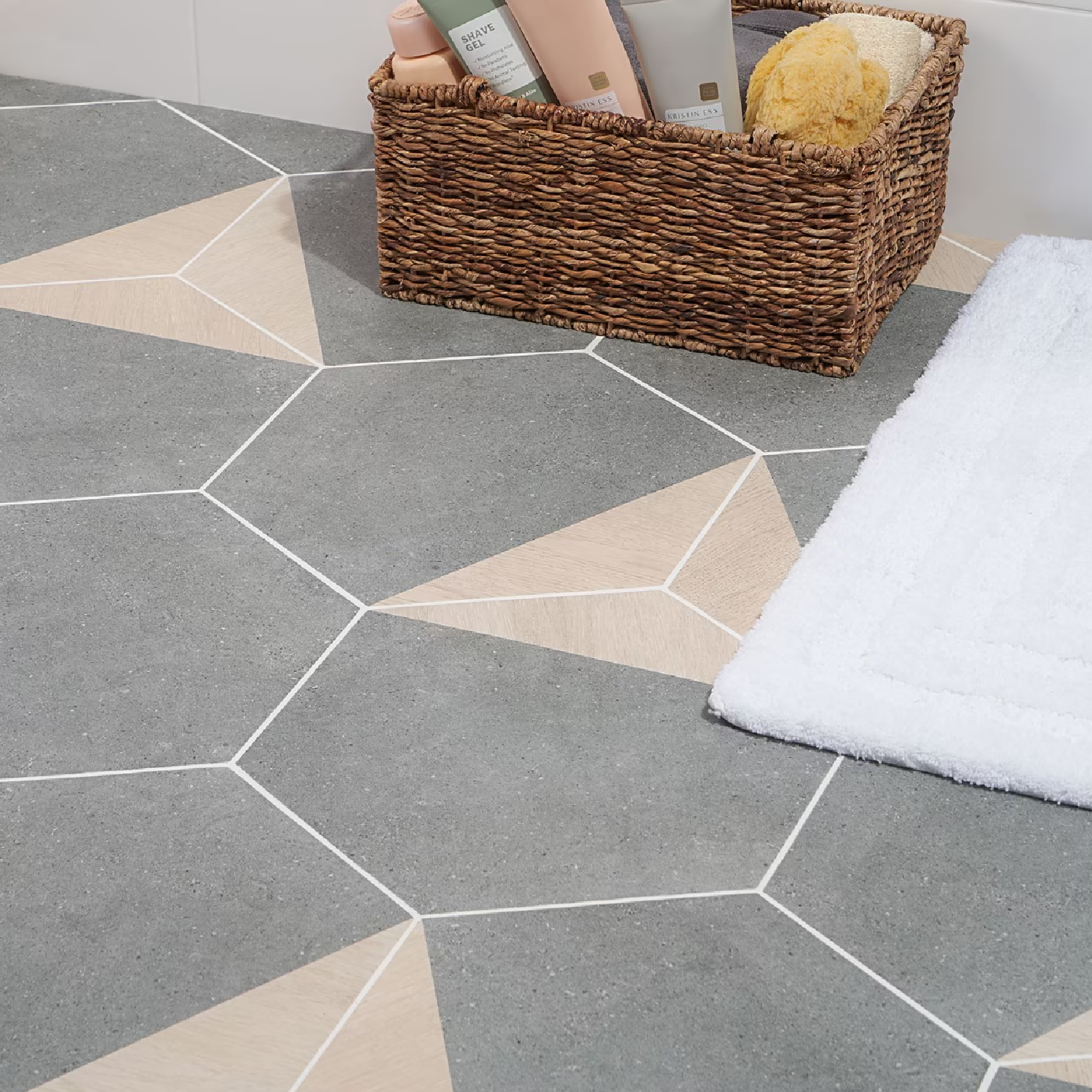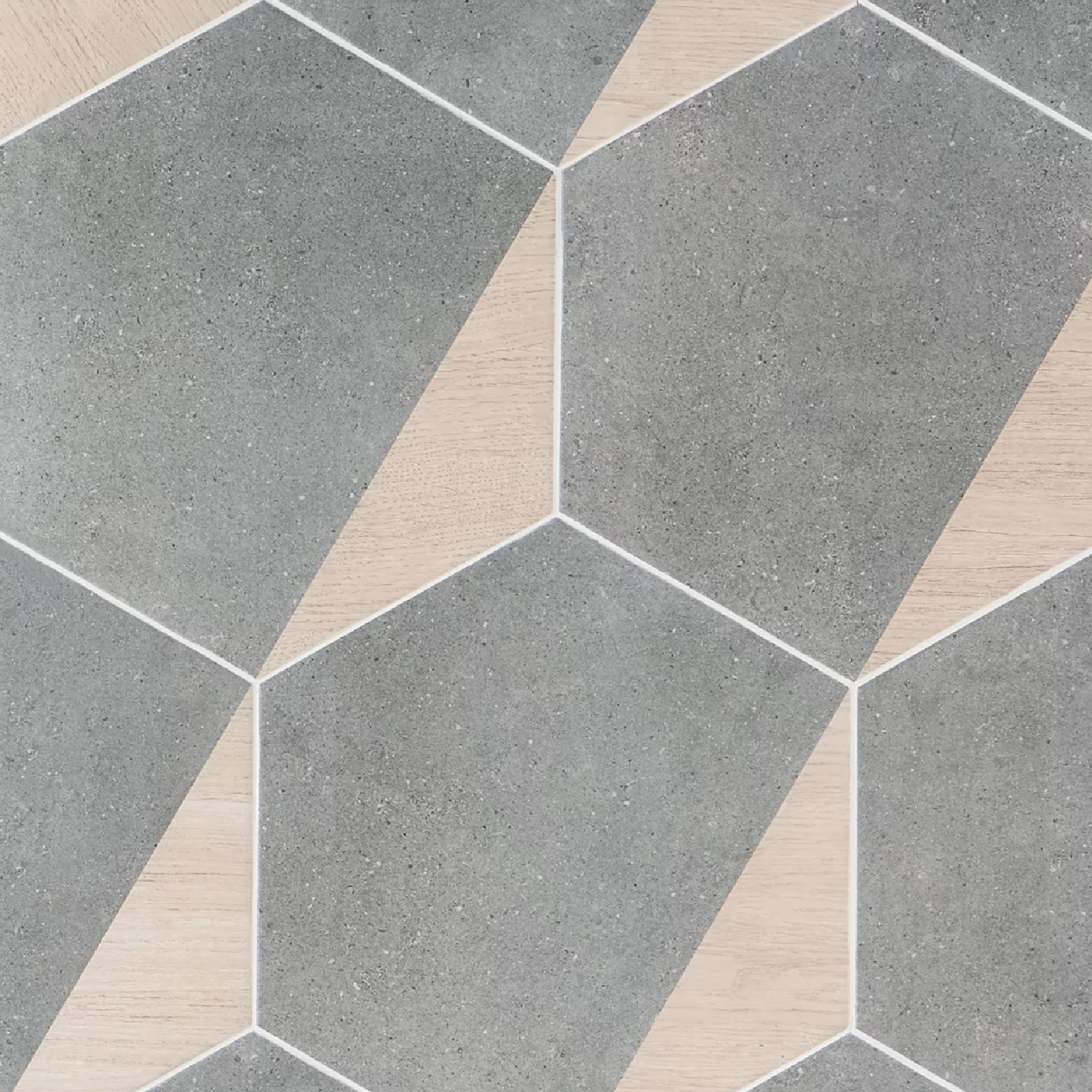 Regular price $84.65Introducing the Pergola Wood Graphite 12.5" Hexagon Matte Porcelain Tile—a fusion of modern design and timeless elegance. Crafted with meticulous attention to detail, this tile captivates with its dark gray concrete-look base complemented by a single sand-colored, wood-look corner. The result? An intriguing interplay of textures and tones that promise endless design possibilities.