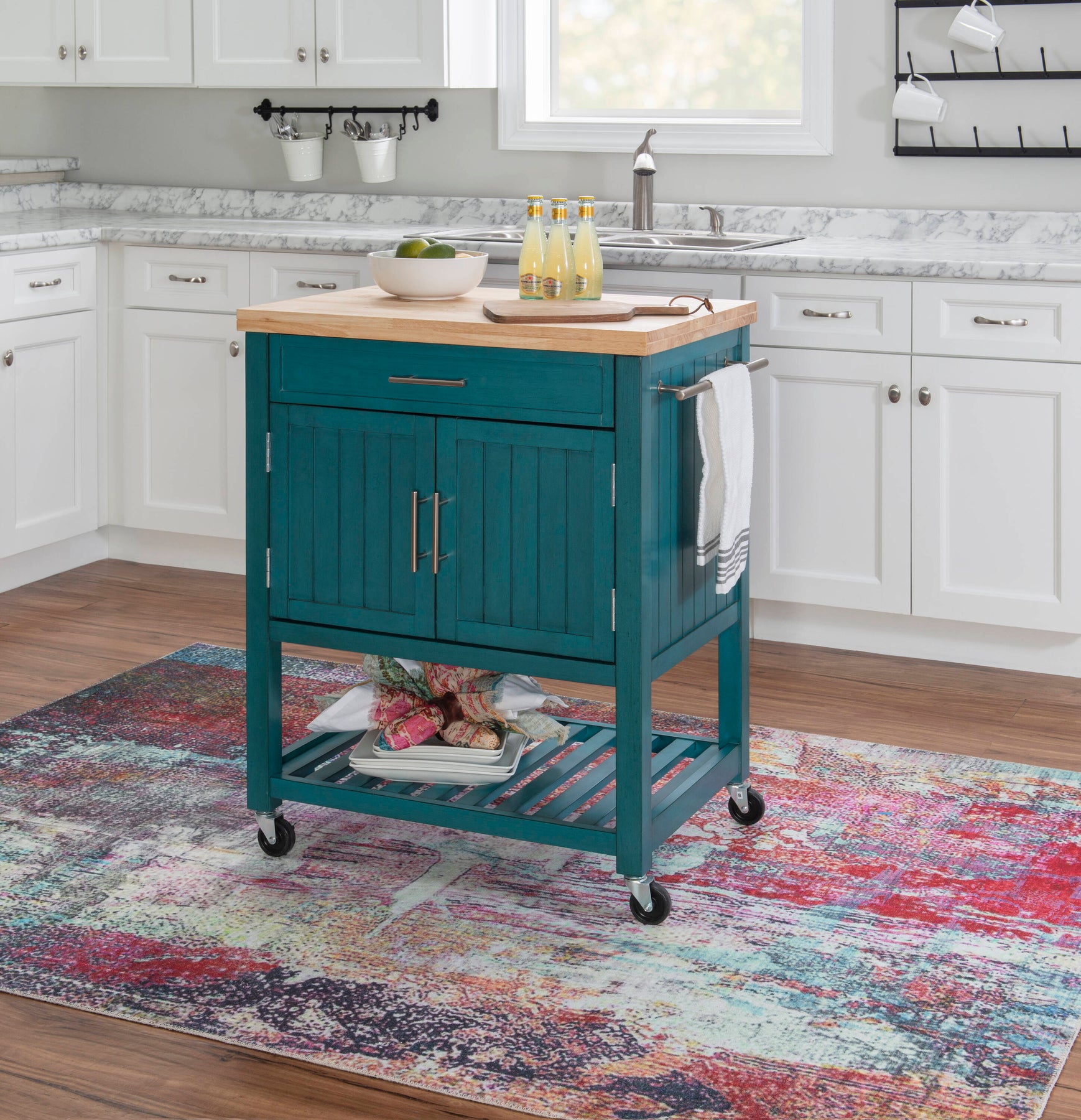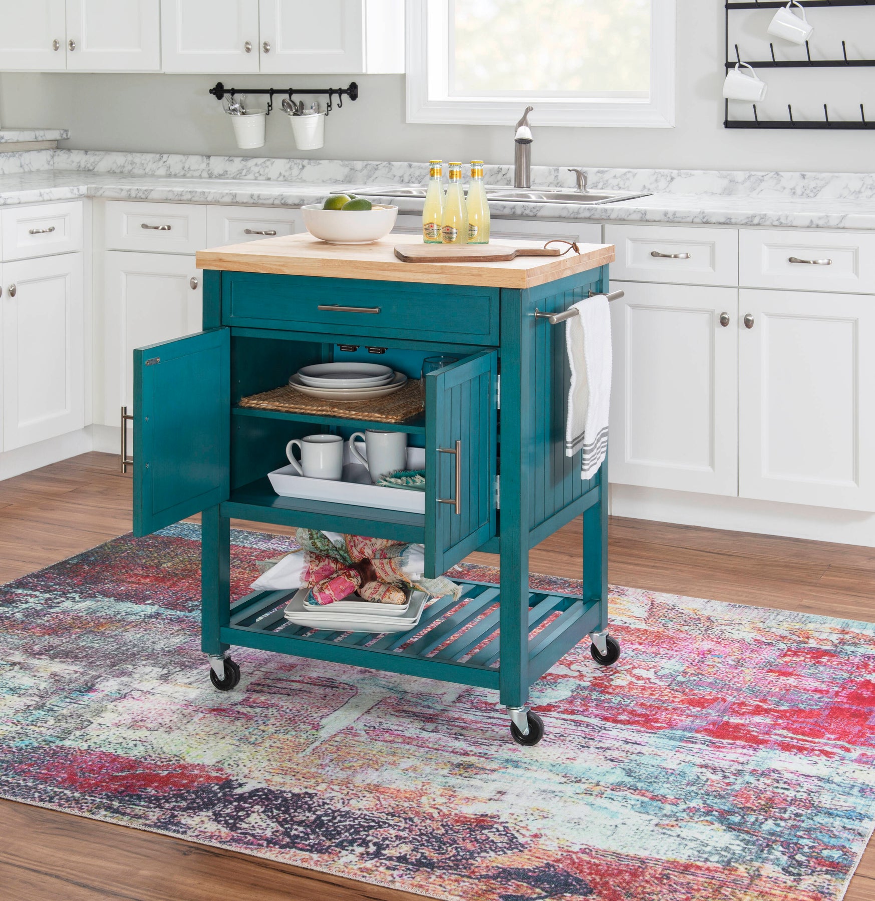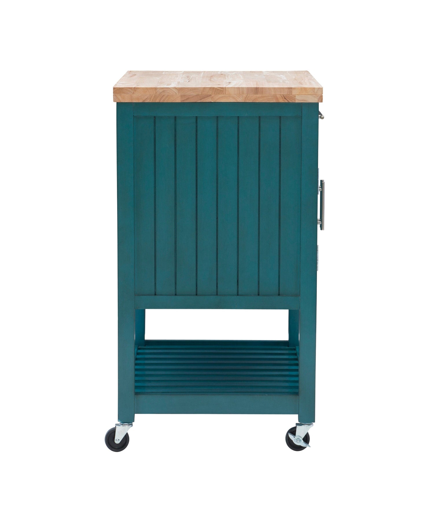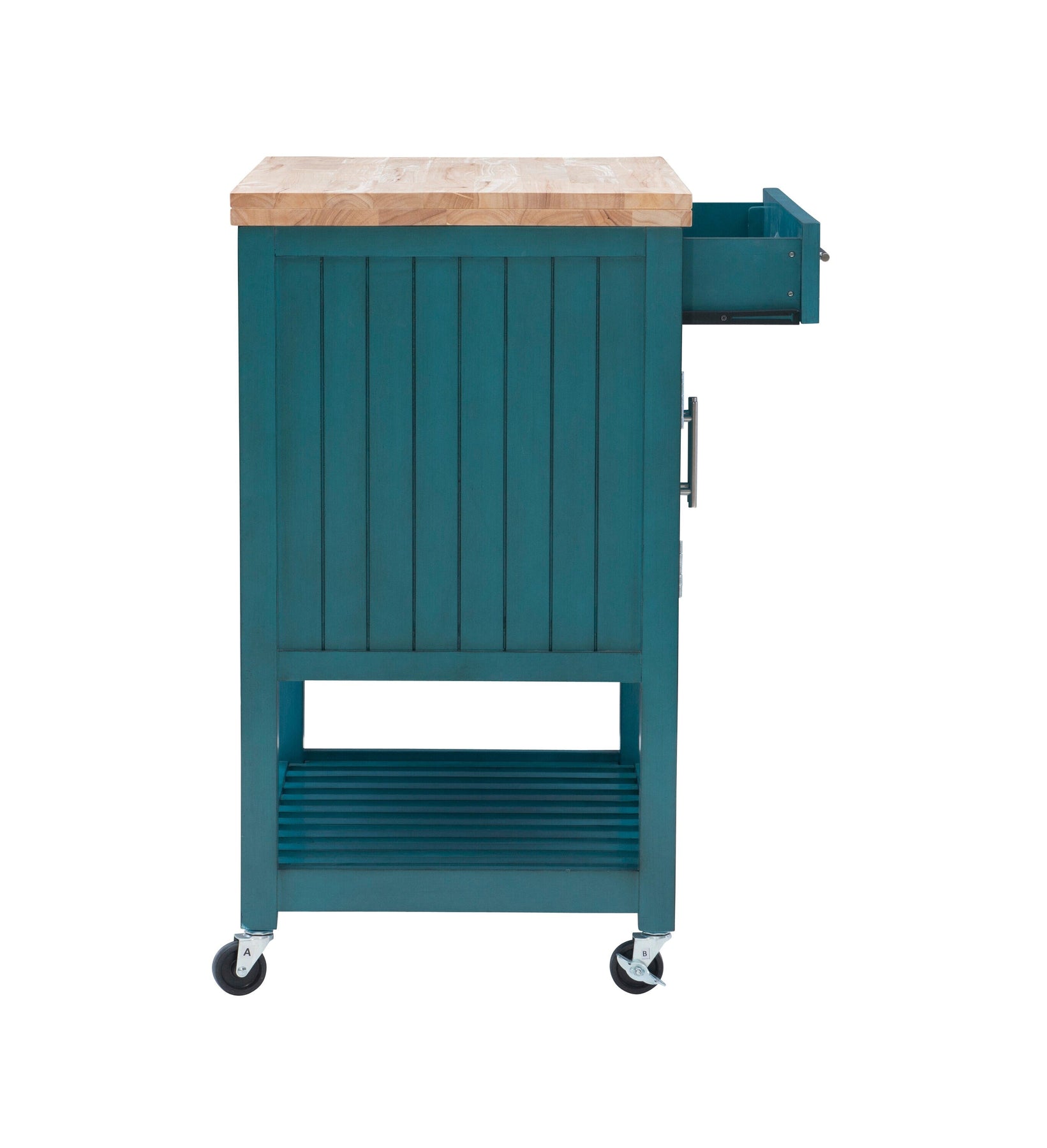 Elevate your kitchen with this versatile rolling kitchen cart featuring a durable butcher block top and a chic green wood base. Its thoughtful design offers ample storage with a wide drawer, cabinet, and open plank shelf while effortlessly enhancing the aesthetic of any cooking space.