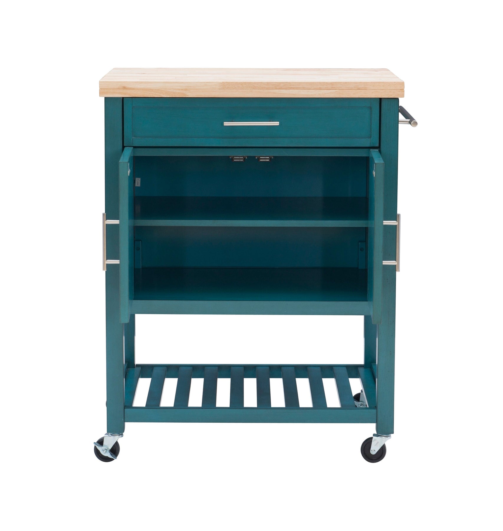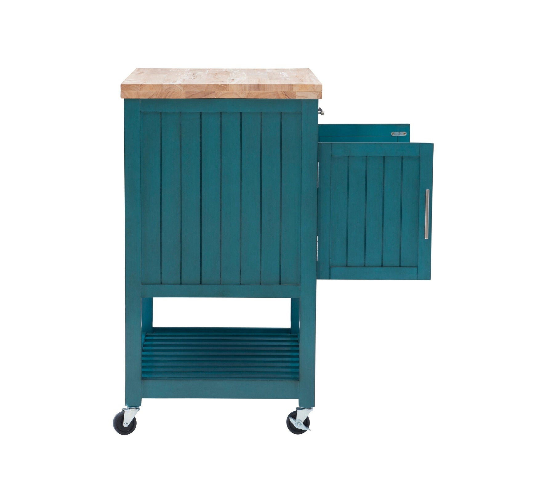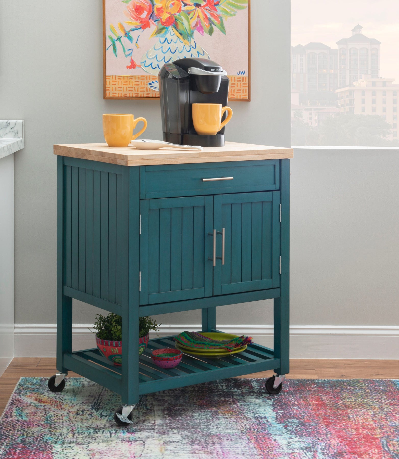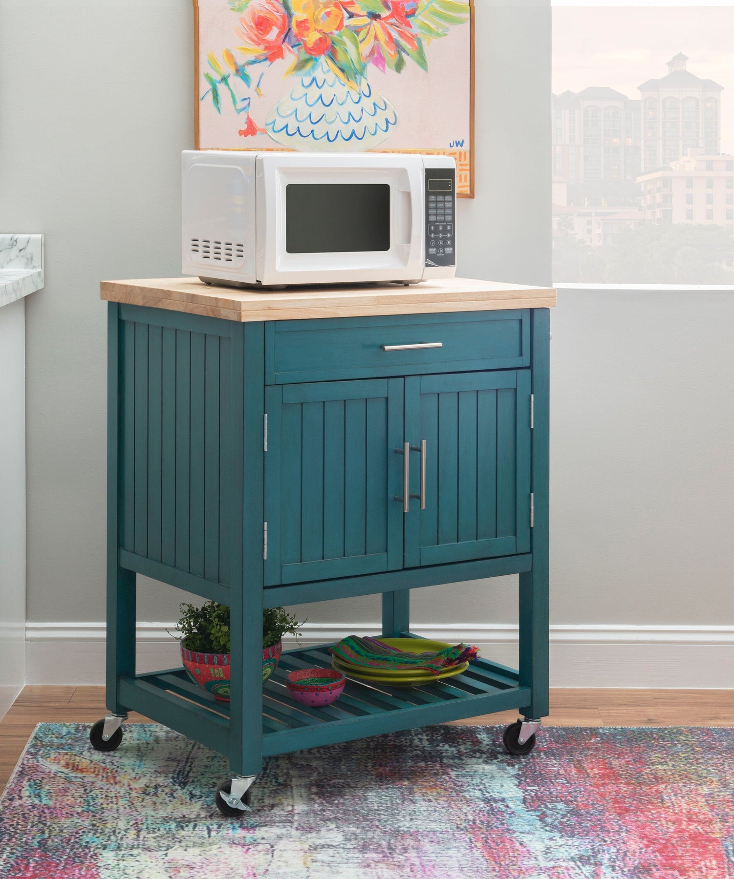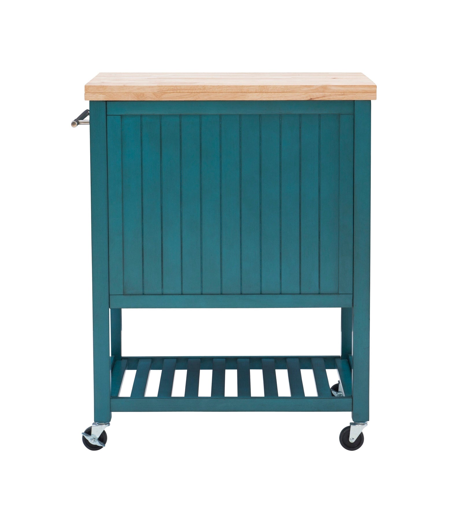 Elevate your kitchen with this versatile rolling kitchen cart featuring a durable butcher block top and a chic green wood base. Its thoughtful design offers ample storage with a wide drawer, cabinet, and open plank shelf while effortlessly enhancing the aesthetic of any cooking space.