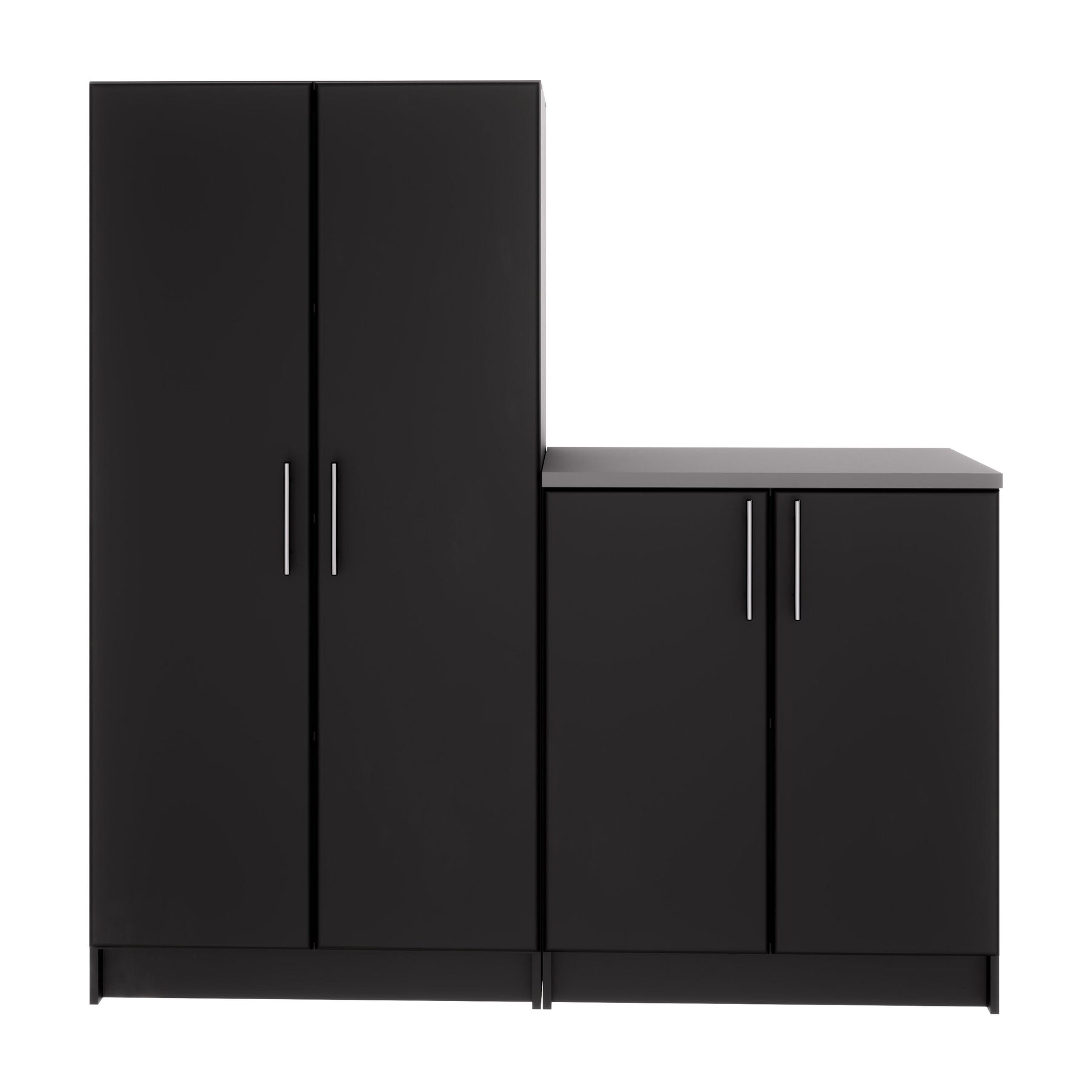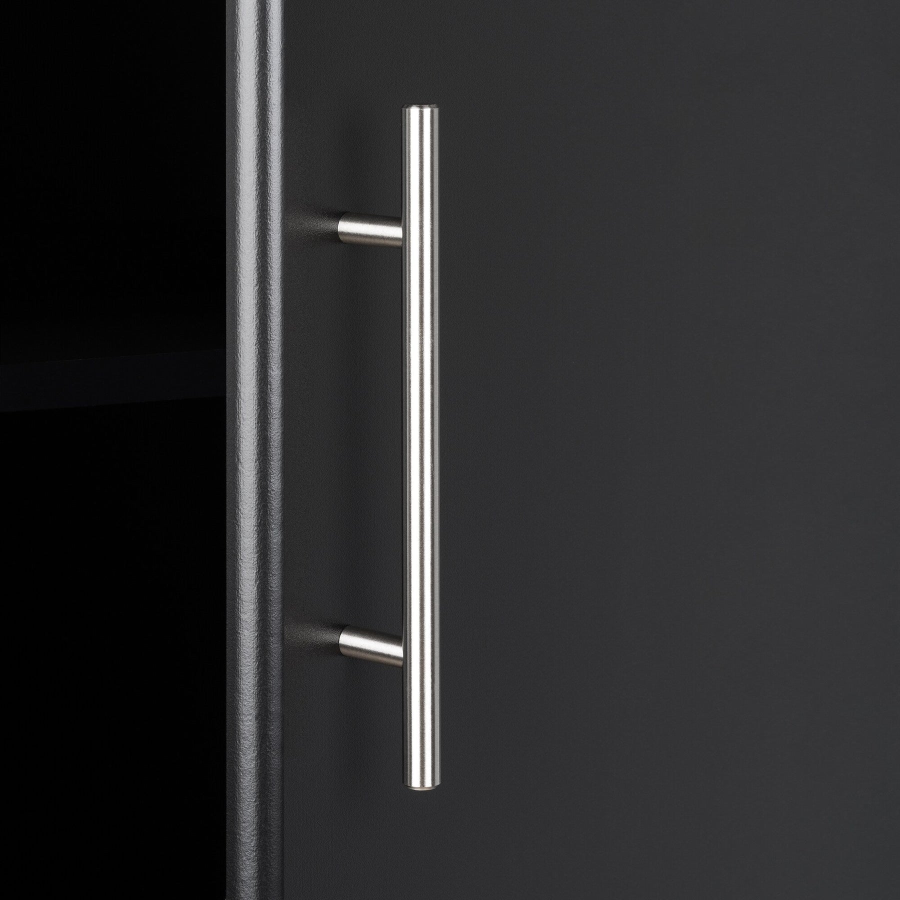 Transform any room into a haven of organized serenity with the Prepac Elite Utility Storage Cabinet. Its sleek black laminate finish exudes sophistication, perfectly complemented by the brushed metal handles and gracefully profiled door edges. Imagine this cabinet anchoring a stylish home office or enhancing a modern garage. With its adjustable shelves, effortless functionality meets impeccable design, making this a quintessential addition for those seeking luxury in utility.