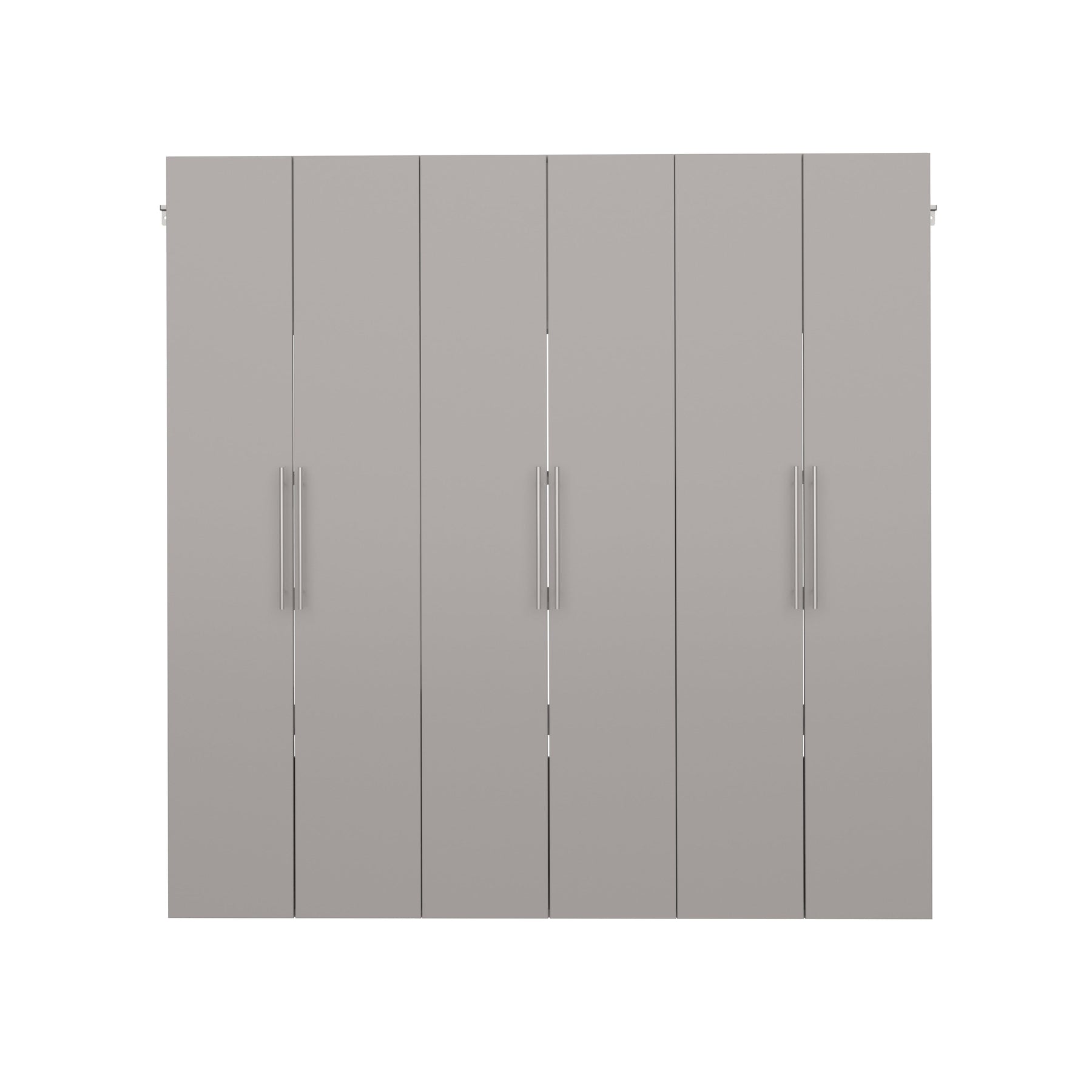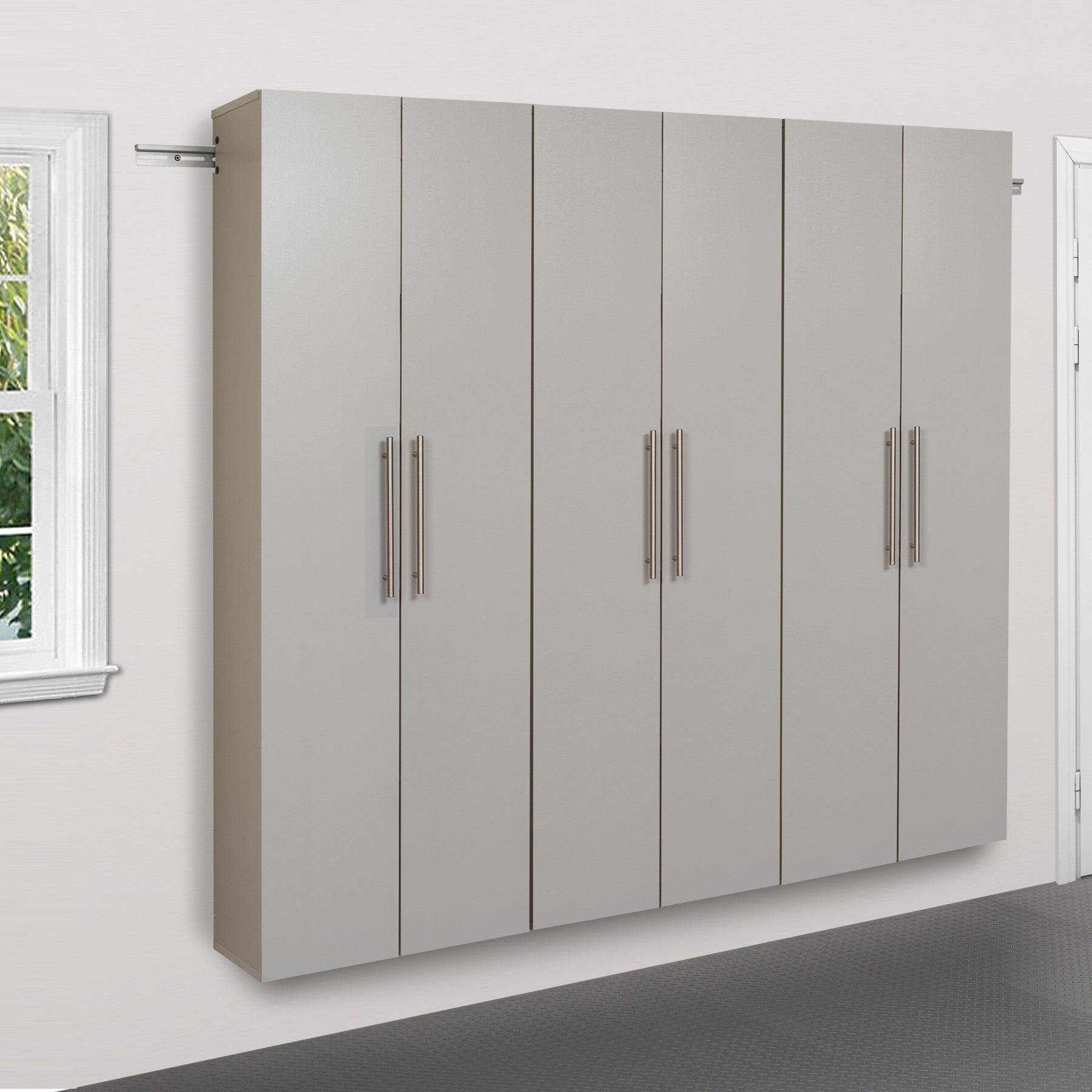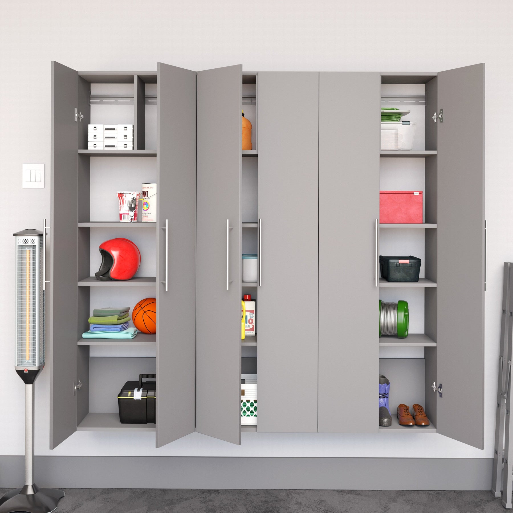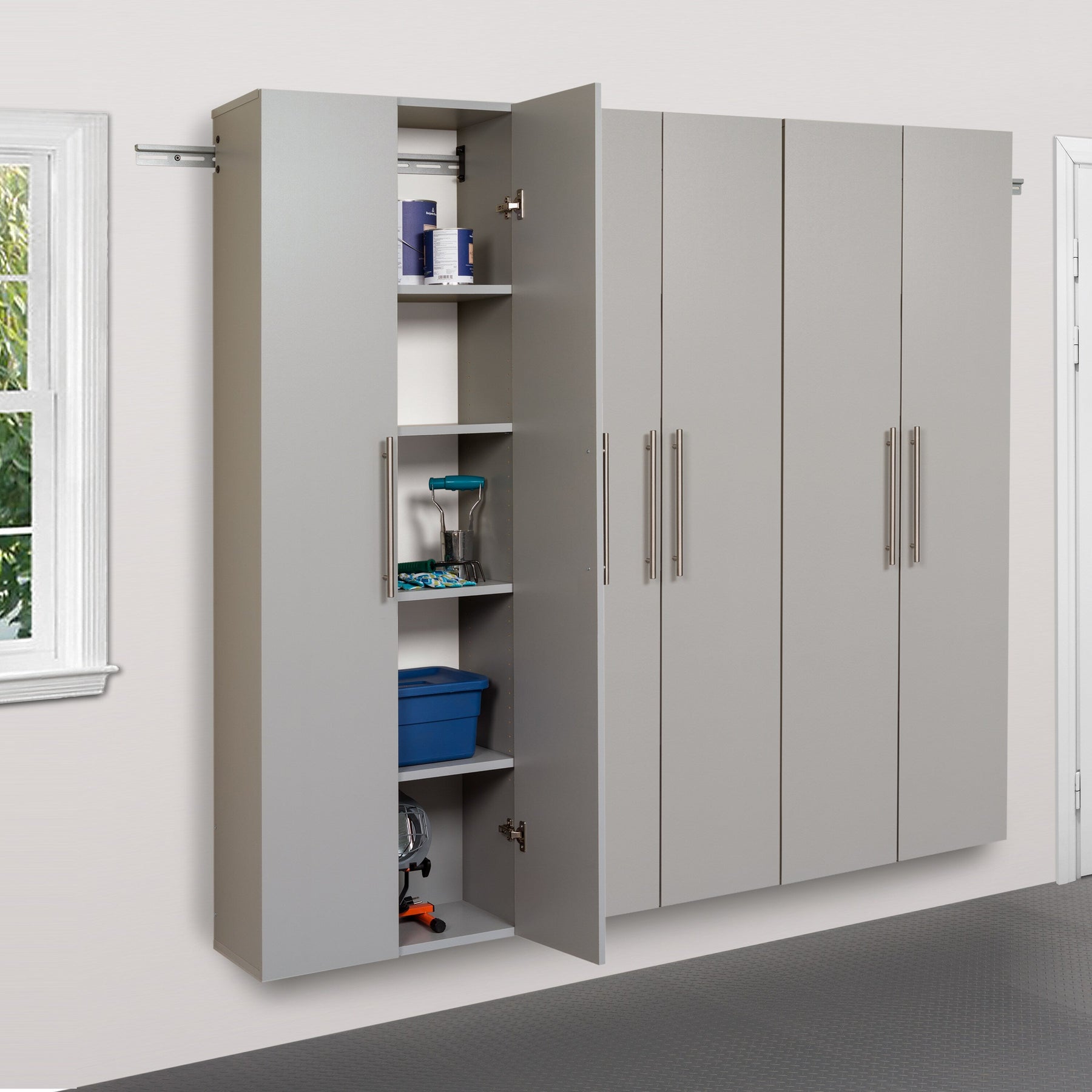 The Prepac HangUps Wall-Mount Utility Storage Cabinet is perfect for maximizing your storage space in garages, laundry rooms, or offices. Its sleek light gray design features a durable wood composite construction, complete with adjustable shelves, making it an ideal solution for clutter management.