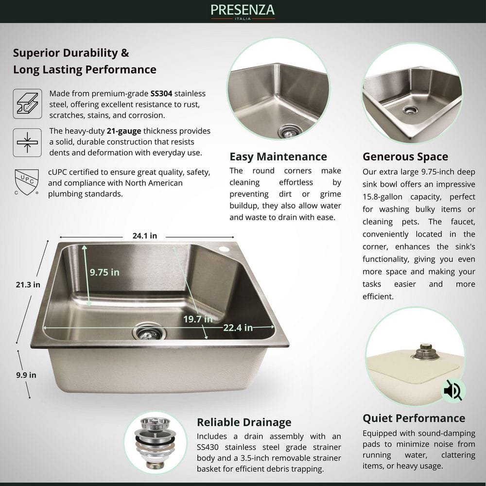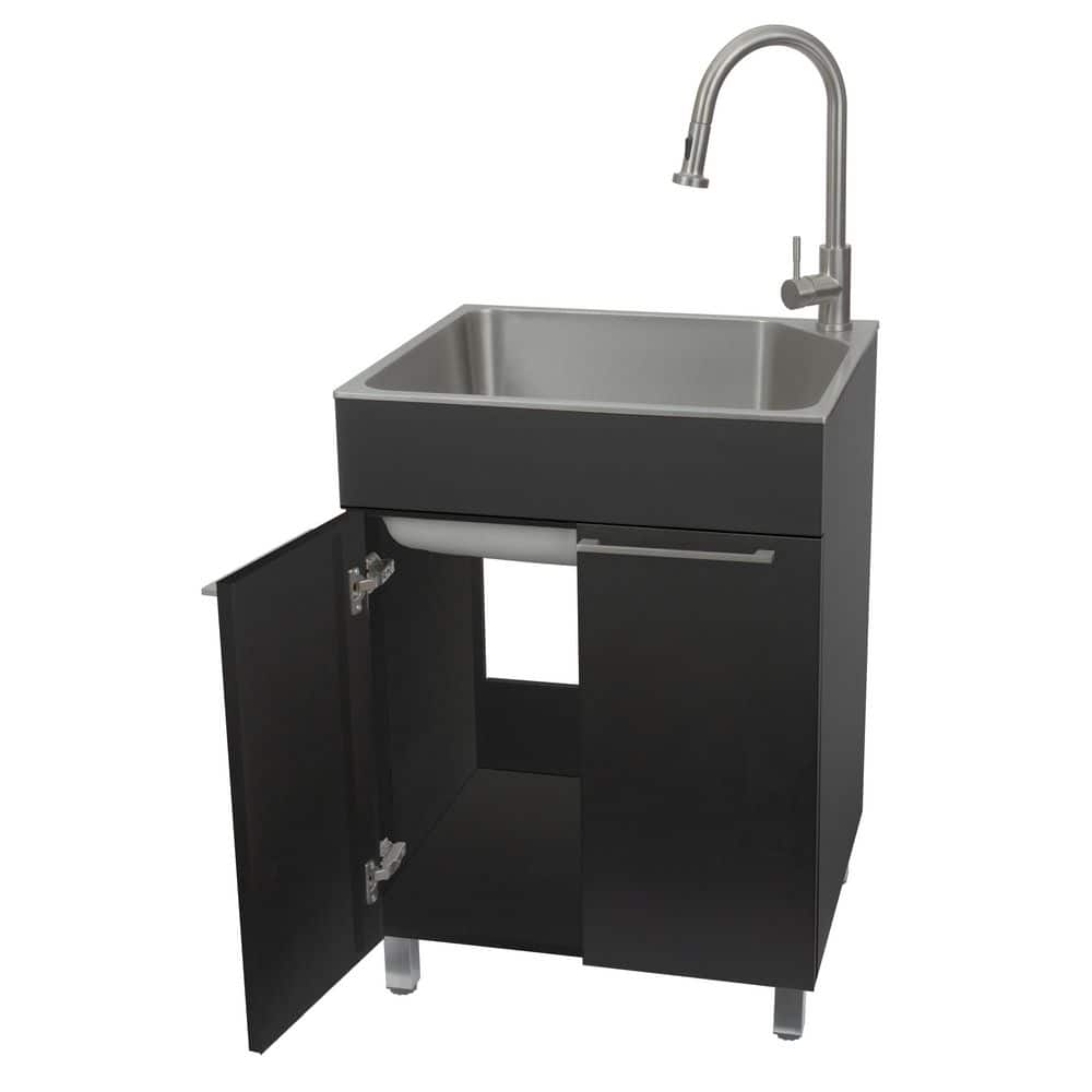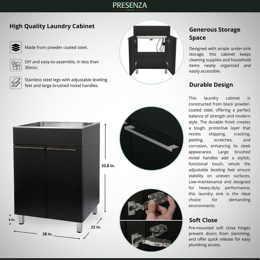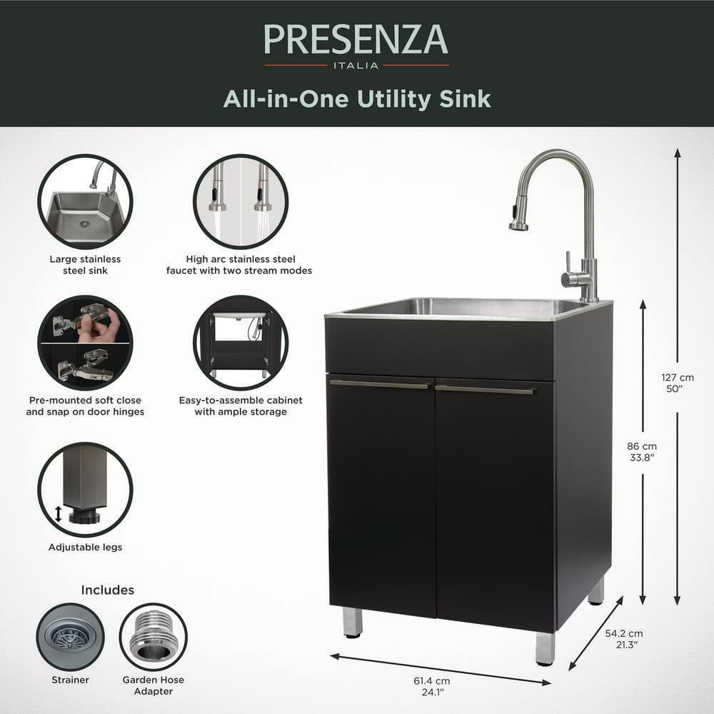 Upgrade your utility space with the Presenza All-in-One Drop-In Sink and Cabinet. This durable 24-inch stainless steel sink features a versatile drop-in design, complete with a sleek black faucet and spacious cabinet storage. Ideal for garages, laundry rooms, or storage areas, it combines high-quality materials with thoughtful design for seamless integration and functionality.