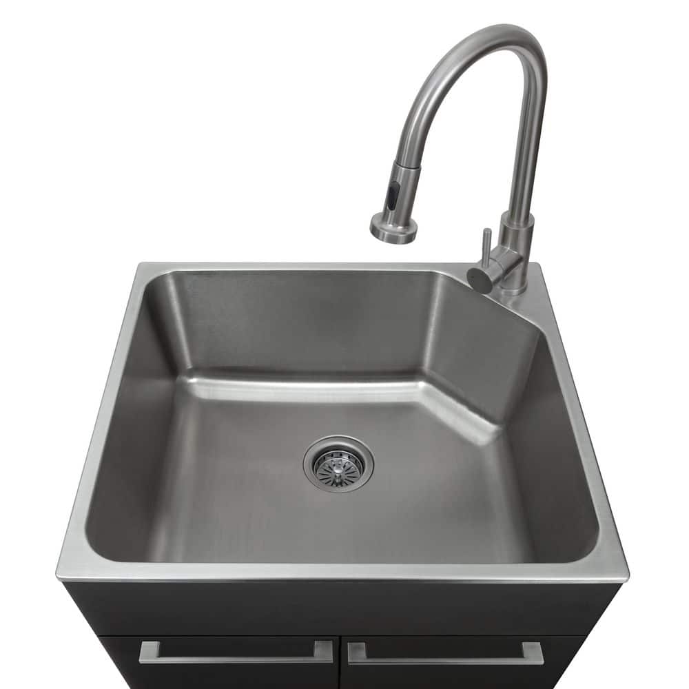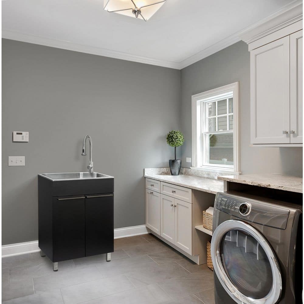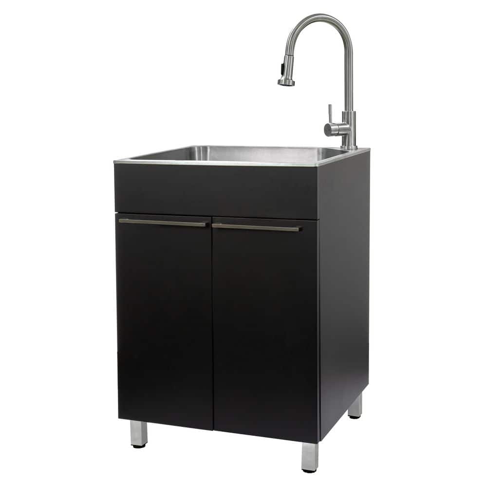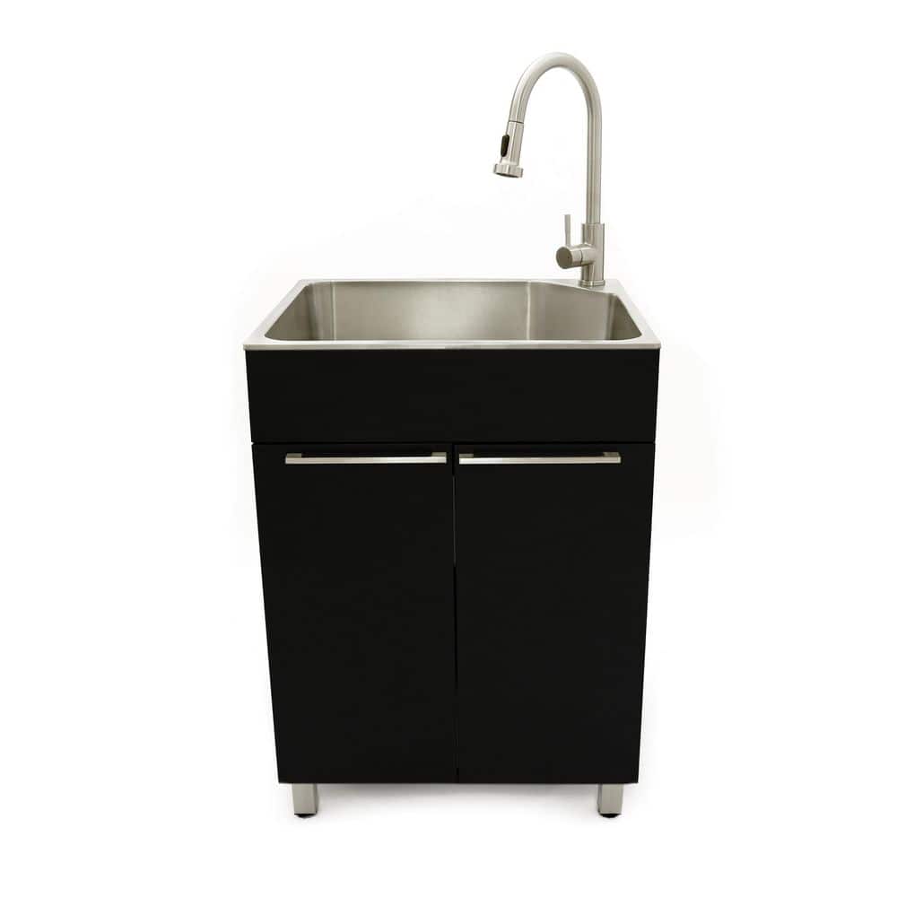 Upgrade your utility space with the Presenza All-in-One Drop-In Sink and Cabinet. This durable 24-inch stainless steel sink features a versatile drop-in design, complete with a sleek black faucet and spacious cabinet storage. Ideal for garages, laundry rooms, or storage areas, it combines high-quality materials with thoughtful design for seamless integration and functionality.