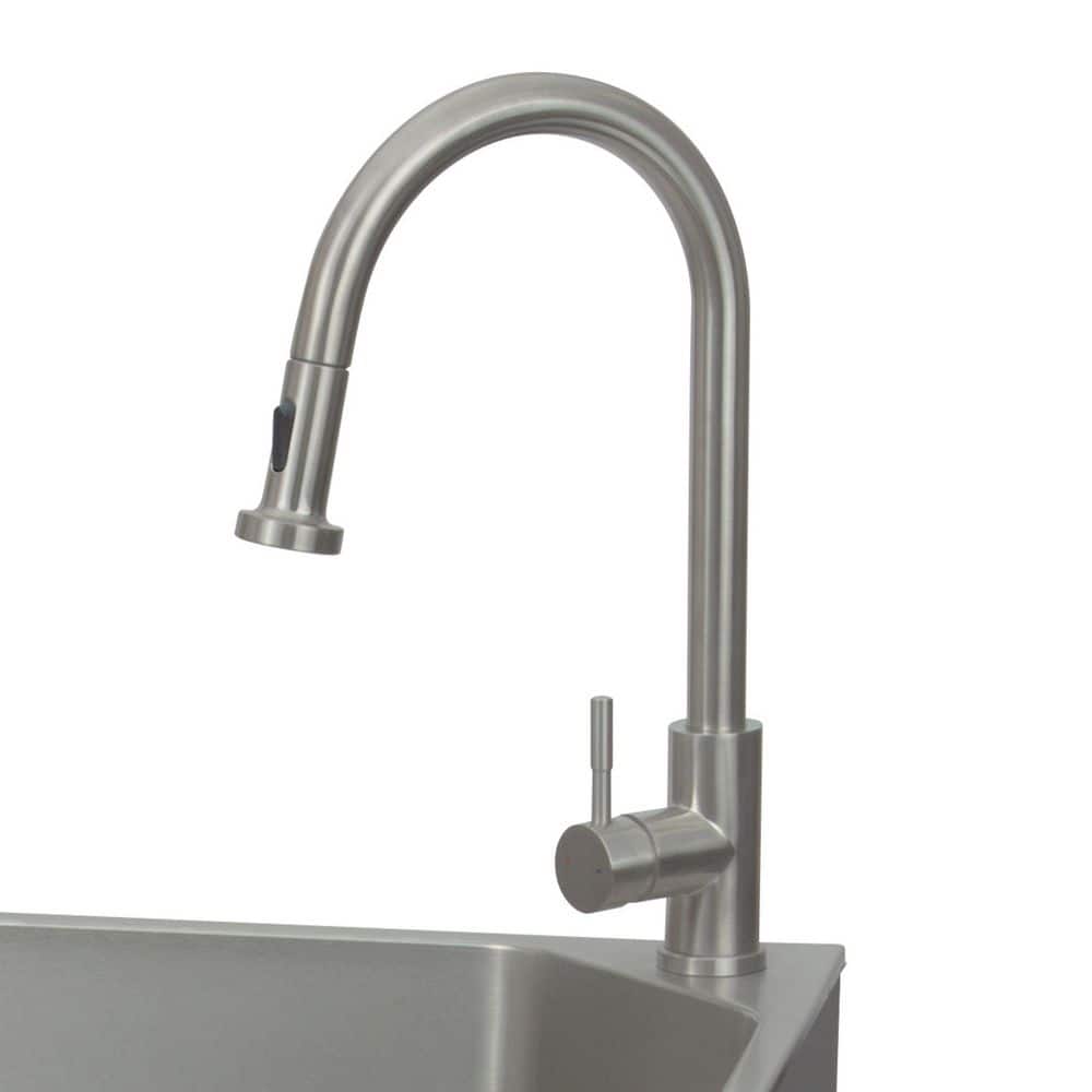 Q: How does the faucet handle heavy use? A: The included stainless steel pull-down faucet features a robust construction and a garden hose adapter, making it ideal for heavy-duty cleaning tasks in garages or laundry rooms.