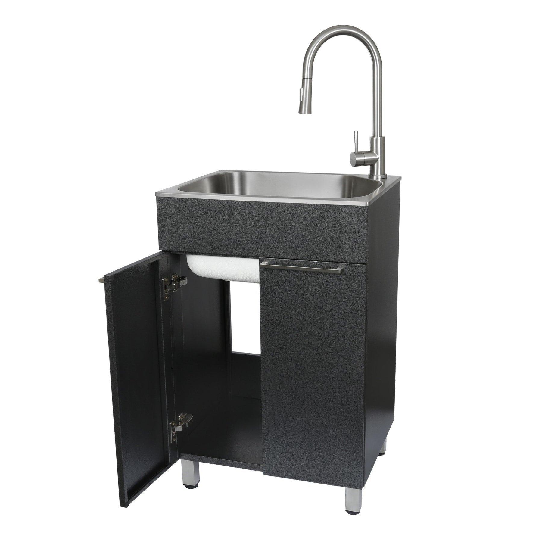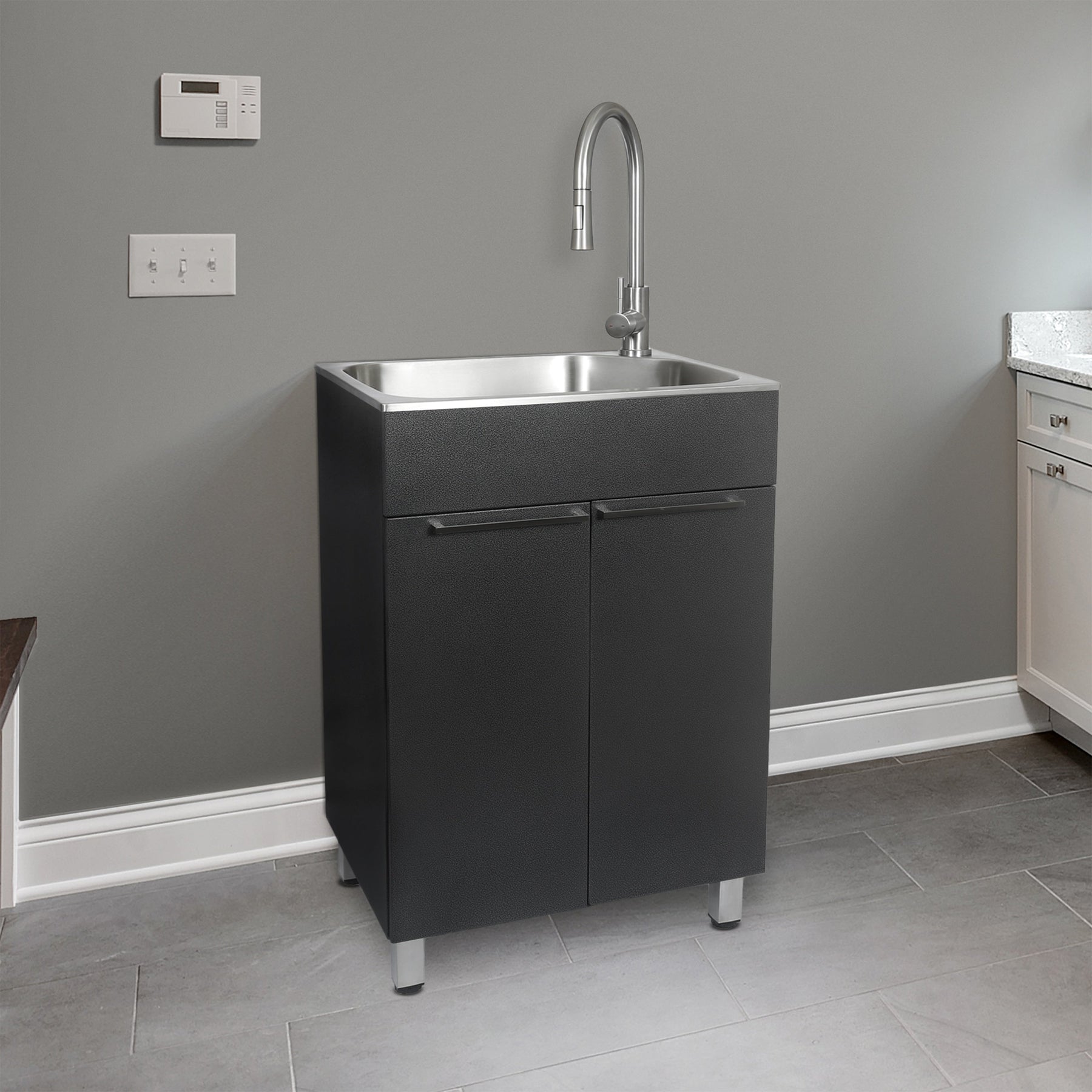 The Presenza Brushed Steel Utility Tub with Faucet offers a stylish and functional upgrade to laundry rooms, workshops, or garages. Featuring a premium stainless steel sink and a convenient storage cabinet, it provides an all-in-one solution for utility tasks, complete with a versatile pull-down faucet for easy cleaning and filling.