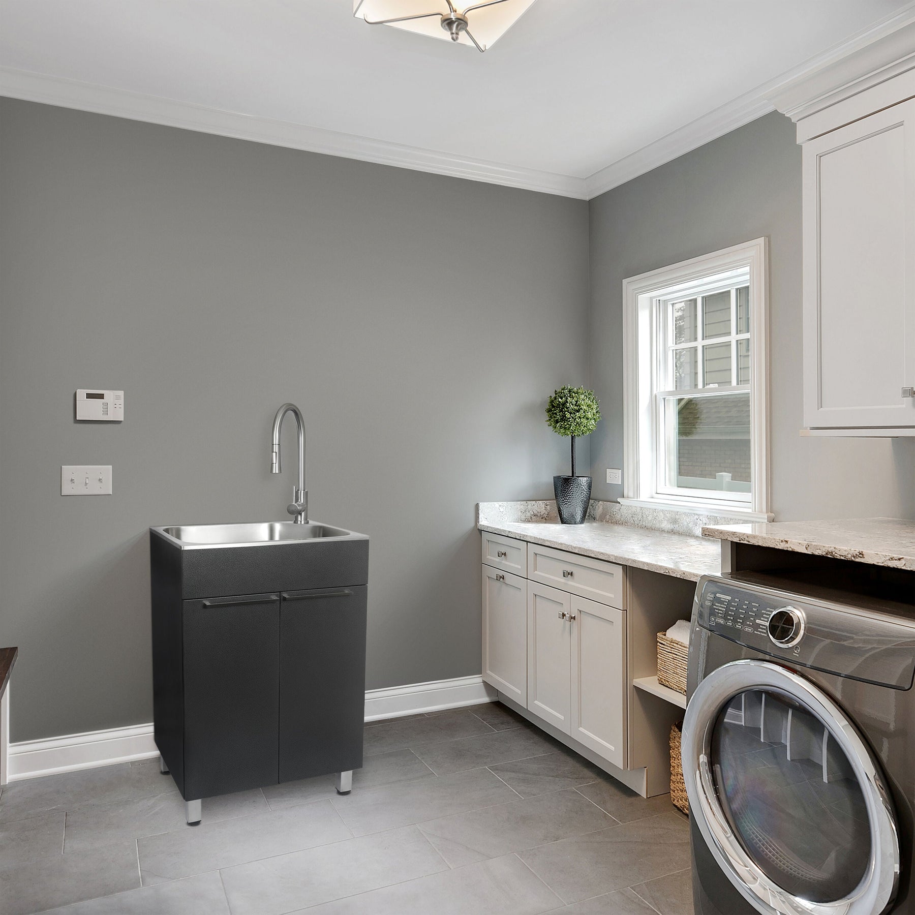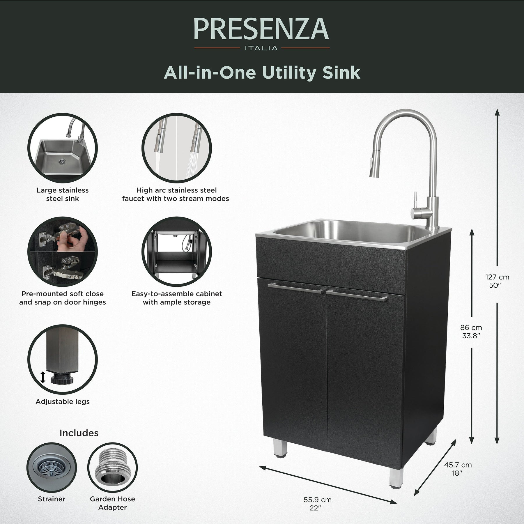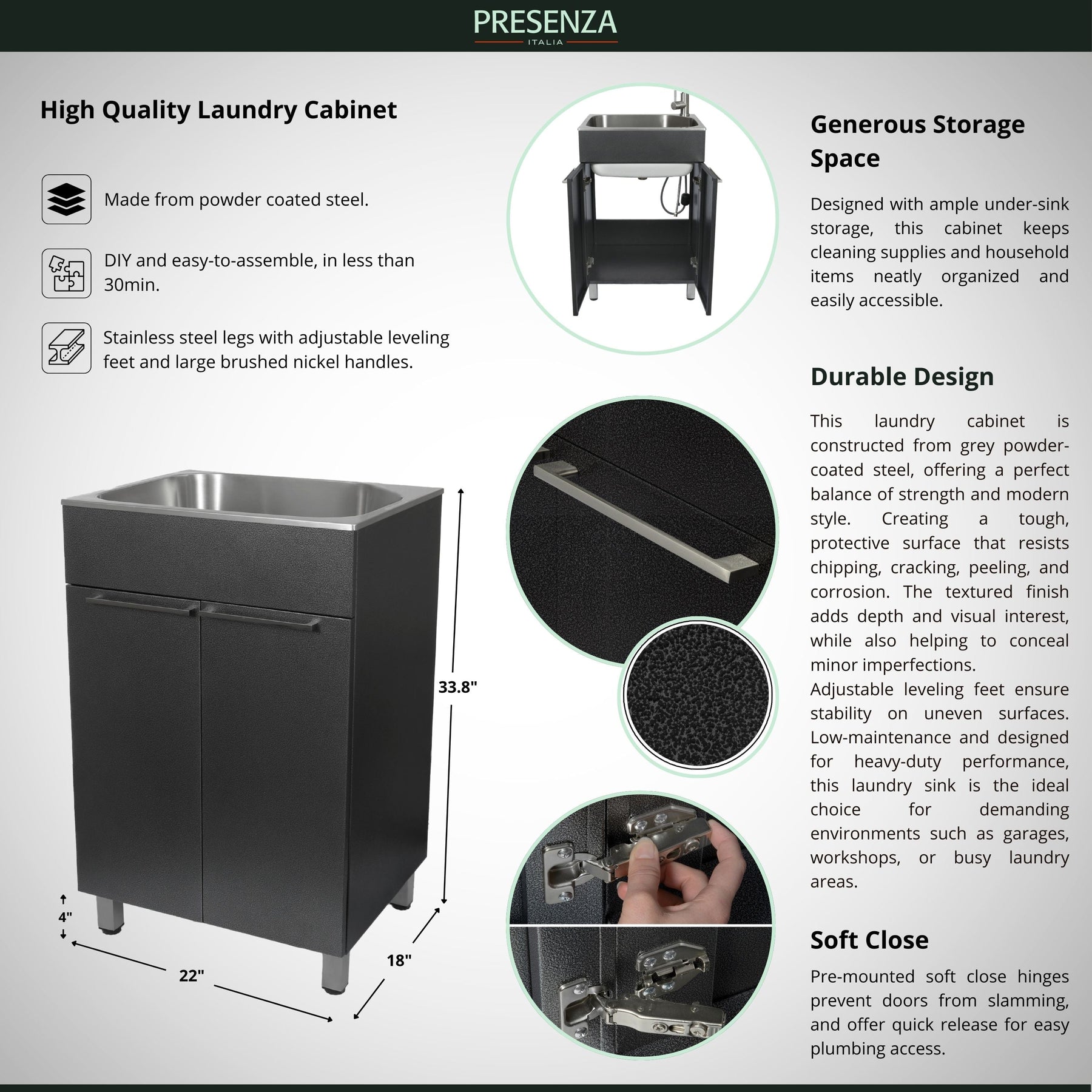 Upgrade your laundry or utility area with the Presenza Drop-In Utility Tub, featuring a robust 304 stainless steel sink paired with a sleek, pull-down faucet. This space-saving unit includes a soft-close storage cabinet that neatly organizes cleaning supplies. Perfect for serious wash tasks or as a convenient pet bath station.