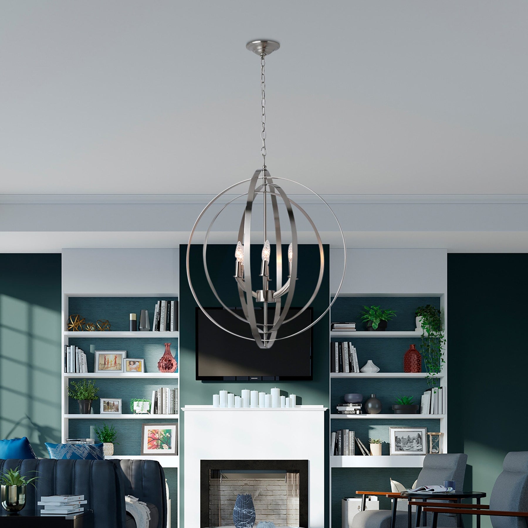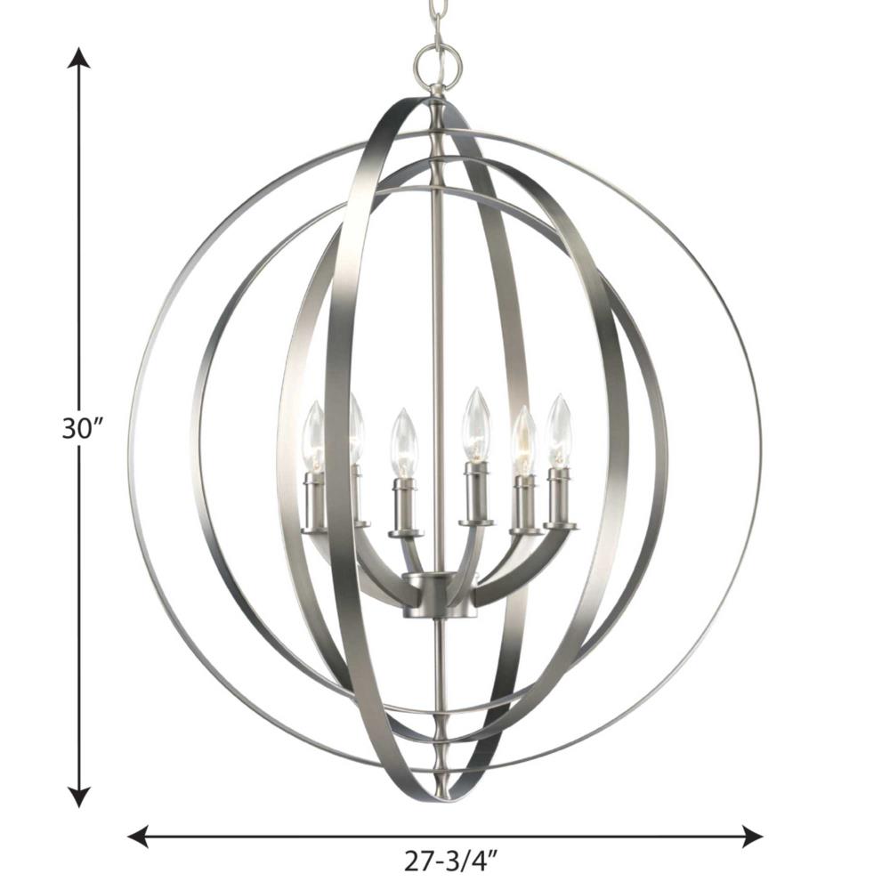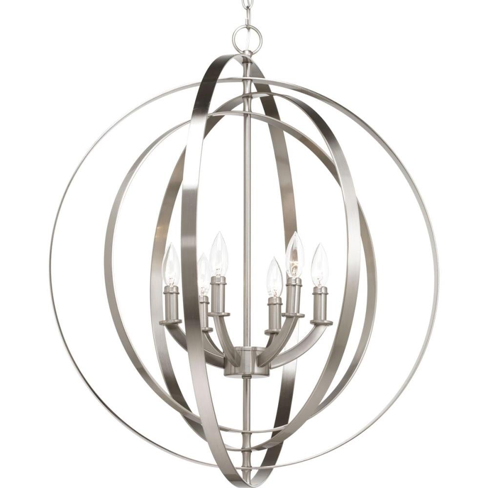 Illuminate your space with the elegant Equinox 6-Light Pendant. Featuring a brushed nickel finish and a striking globe design, this light fixture offers both style and functionality. Its multi-directional rings are inspired by celestial movement, making it a captivating addition to any home setting.