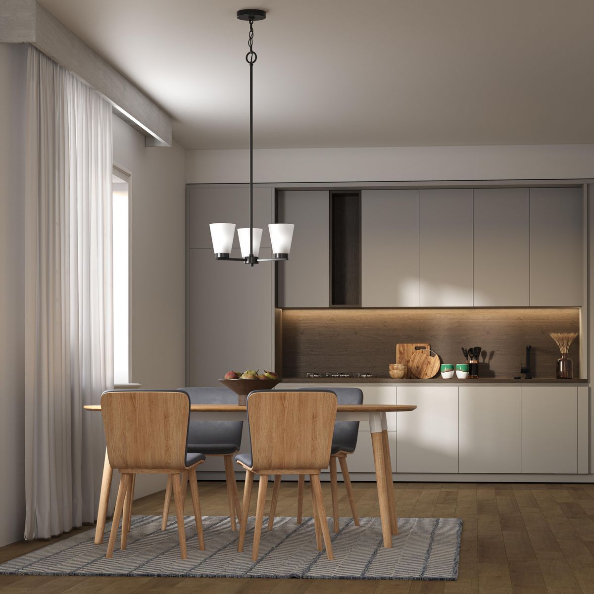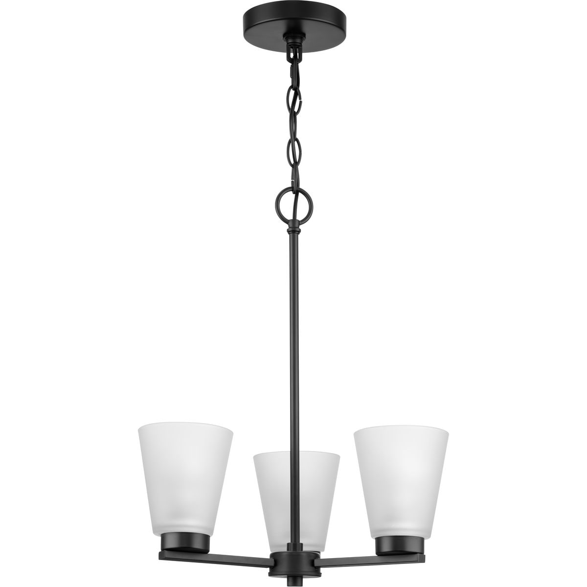 The Tanner 3-Light Matte Black Chandelier from Progress Lighting is an exquisite piece that balances strong, clean lines with the soft elegance of etched glass shades. It's perfect for illuminating kitchen islands, breakfast nooks, or dining rooms, offering both functional and atmospheric lighting with a versatile design. Customize its hanging height to fit your space effortlessly, enhancing any transitional interior with its striking matte black finish.