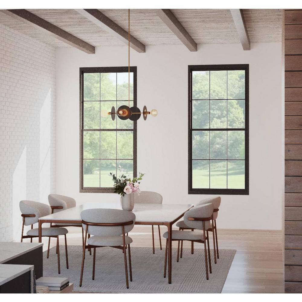 The Trimble Chandelier transforms any room with its bold mid-century aesthetic, casting an inviting glow across your space. Its dual-tone finish in brushed bronze and matte black adds rich, layered elegance, making it a striking centerpiece. Style it above a minimalist dining table or in a modern kitchen for a captivating focal point. This chandelier is not just a lighting fixture; it's a statement piece that embodies the essence of luxurious living with a contemporary twist.