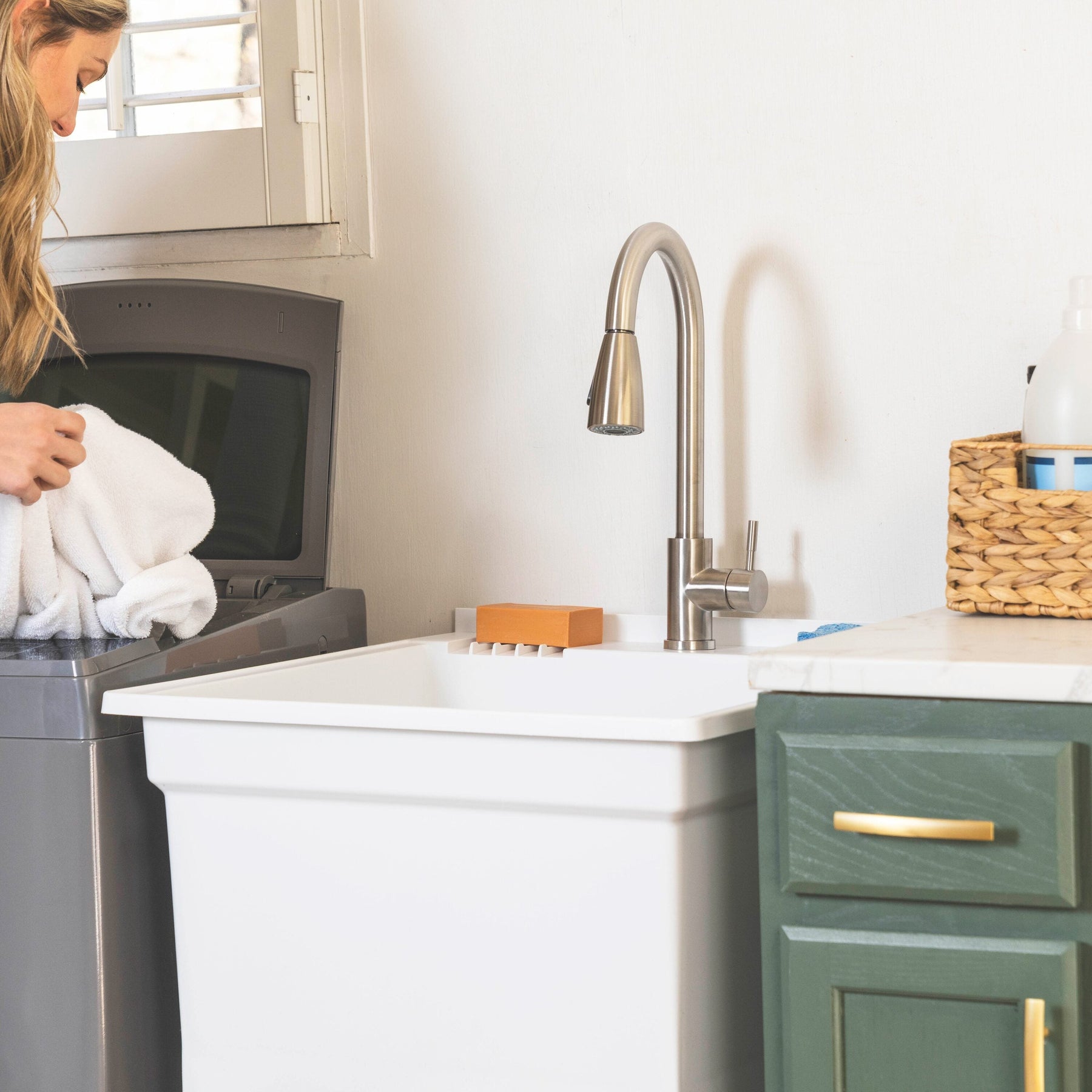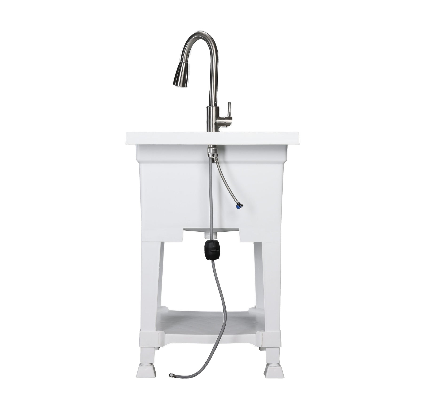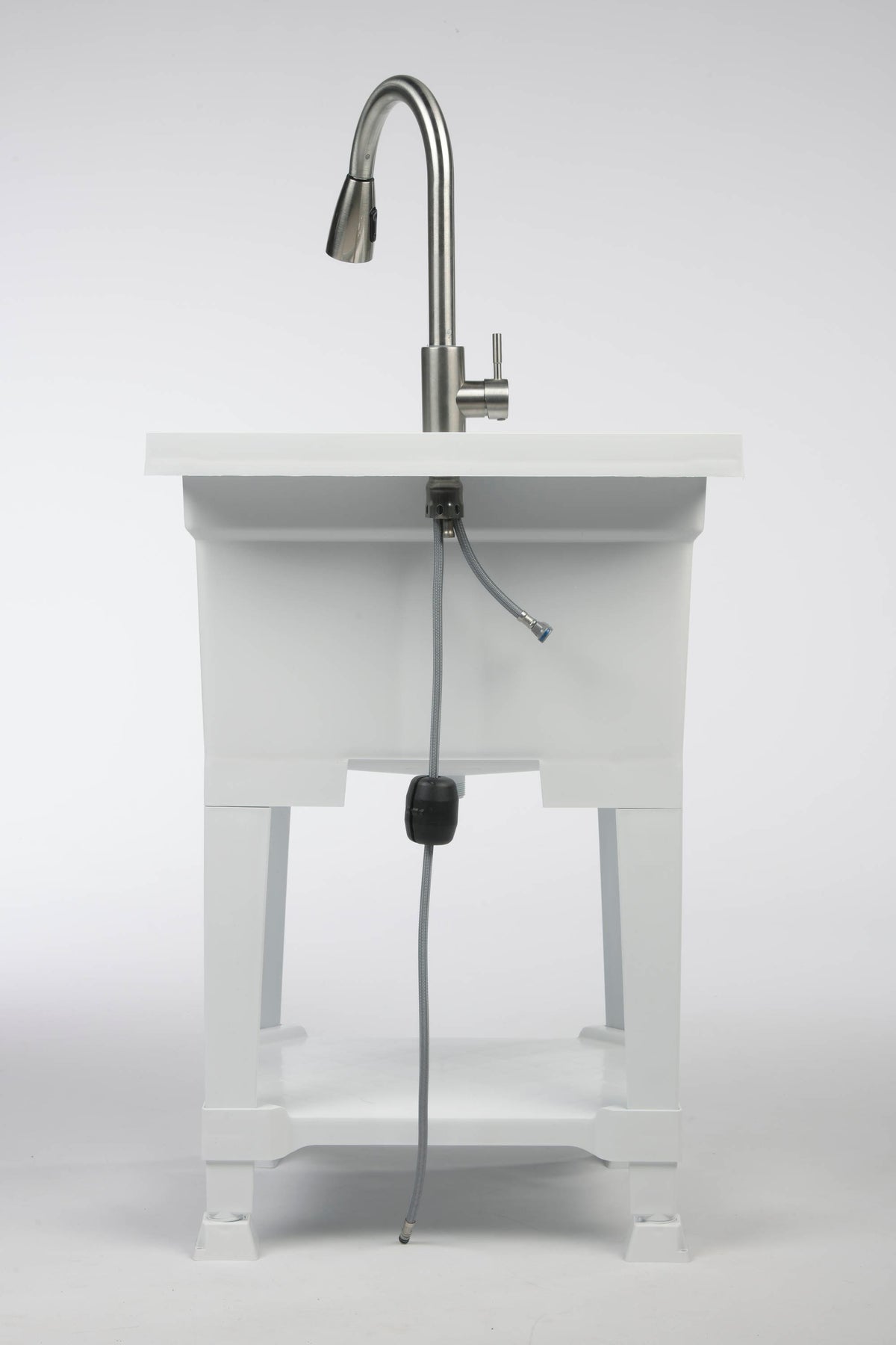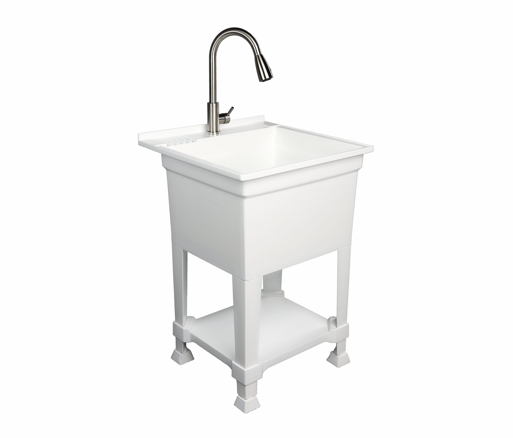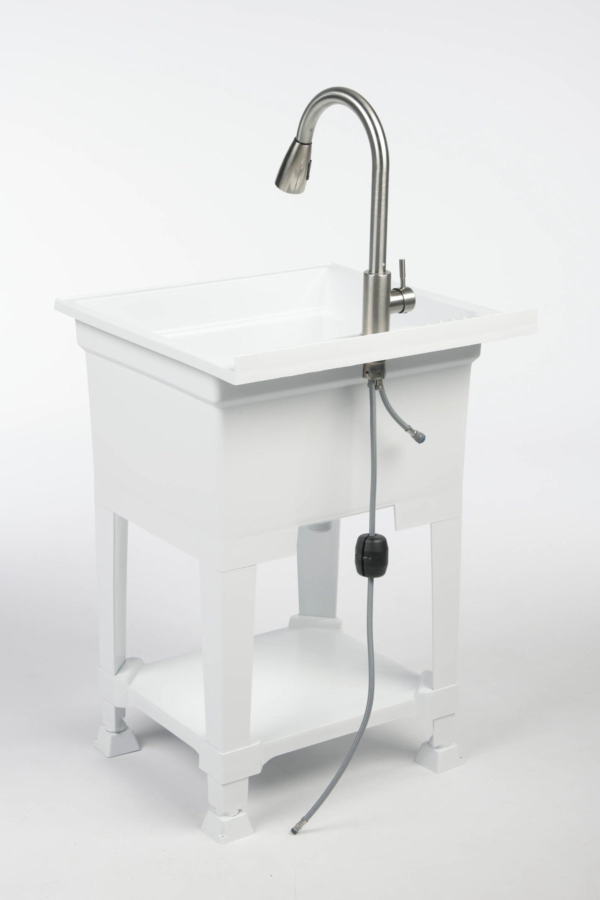 The Project Source 24-in x 24-in Freestanding Utility Tub is a versatile and durable solution for any home improvement project. Complete with a stainless steel faucet and a quick-connect drain, this easy-to-assemble utility sink offers convenient use in laundry rooms, mudrooms, or garages.