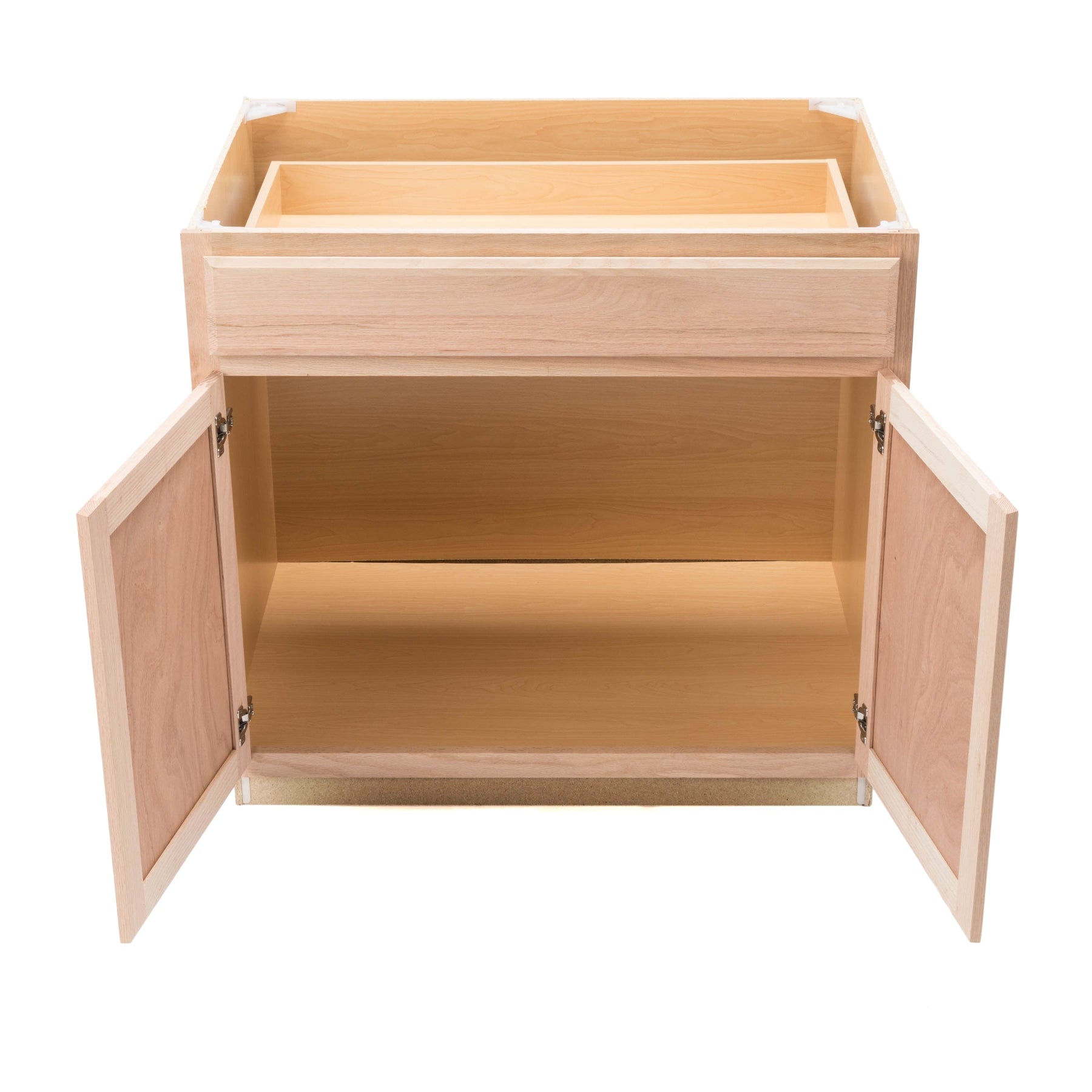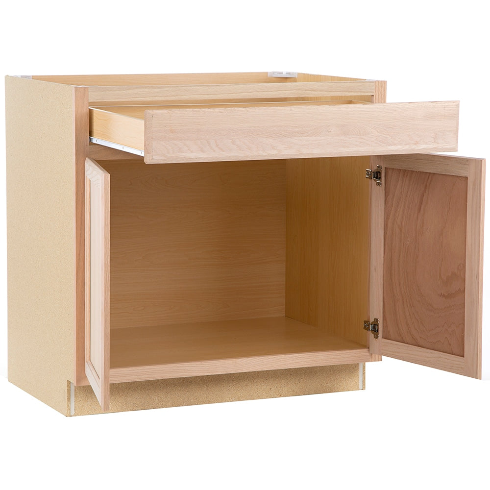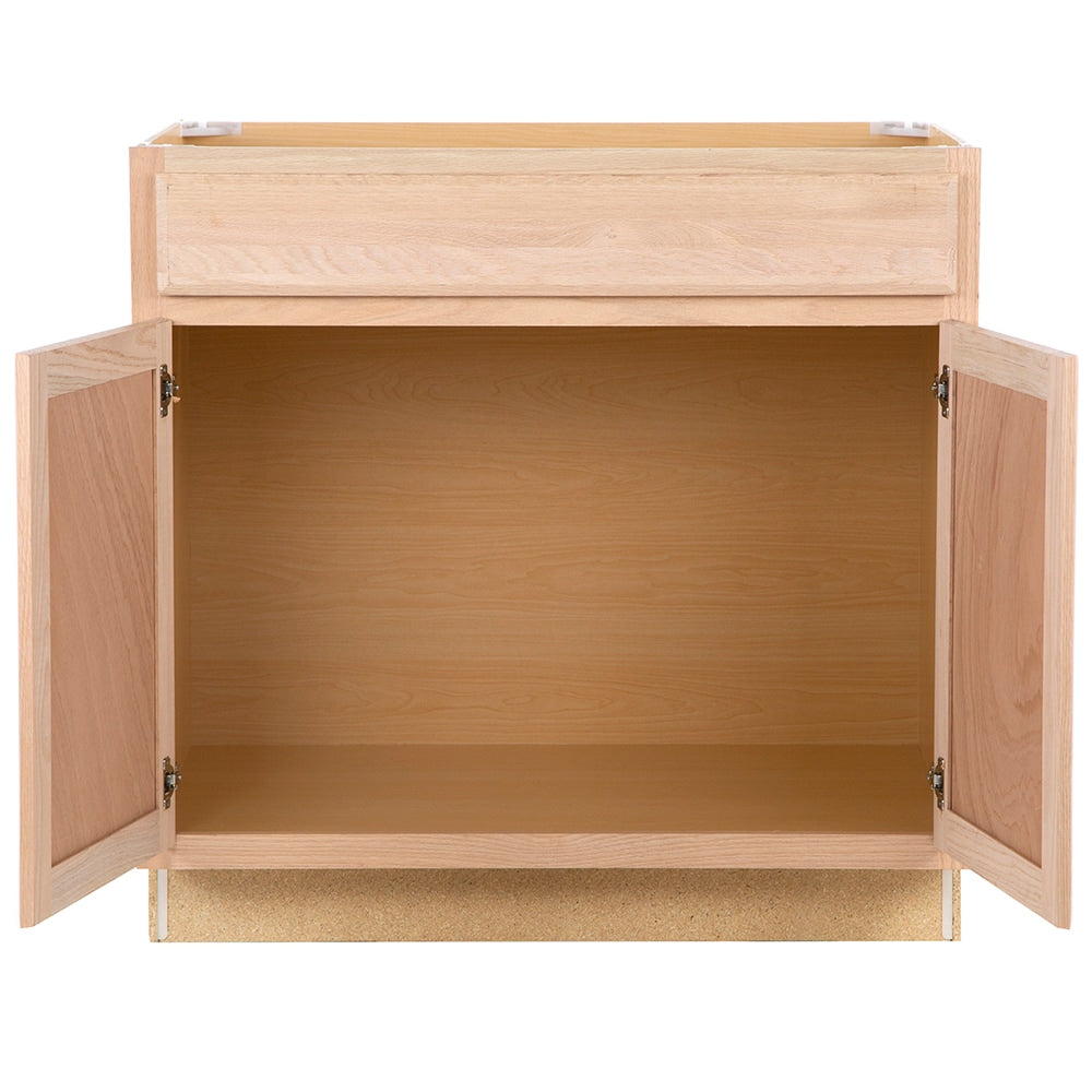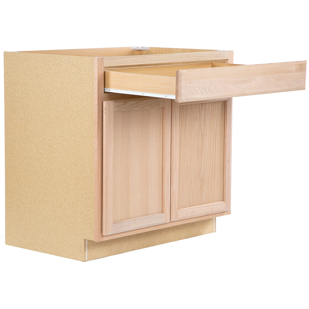 Enhance your kitchen with the Oak Brook 36" Unfinished Oak Base Cabinet, designed for versatility and functionality. This fully assembled cabinet boasts solid wood construction with a stylish flat panel square design, offering a classic and customizable option for any home improvement project.