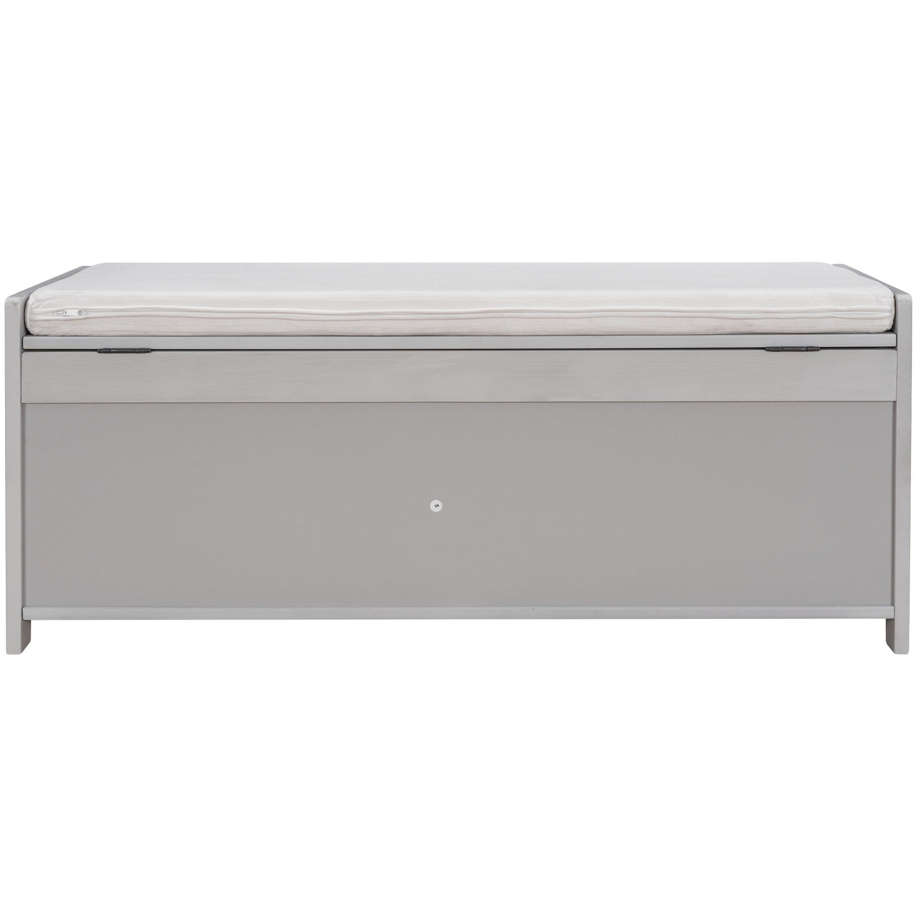 The Qualler Modern Gray Storage Bench in Gray Wash combines rustic charm with contemporary functionality, serving as both a comfortable seat and a multi-functional storage solution. Its cleverly designed compartments include a hidden space under the cushion for added privacy, making this bench ideal for entryways while complementing any modern decor style.