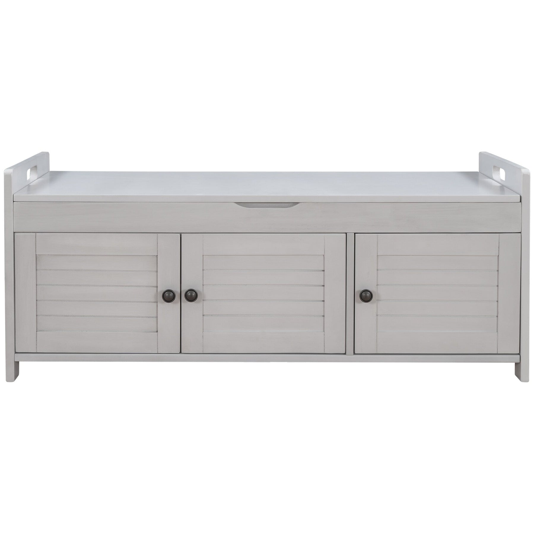 The Qualler Modern Gray Storage Bench redefines the classic entryway piece, infusing your home with rustic sophistication. Its industrial metal handles paired with a vintage shutter door design offer a tasteful juxtaposition, making it a stunning focal point. Opt for a plush throw draped over its upholstered top for a cozy touch. This bench is not just functional; it is a testament to stylish, premium living, perfect for effortless organization and aesthetic appeal.
