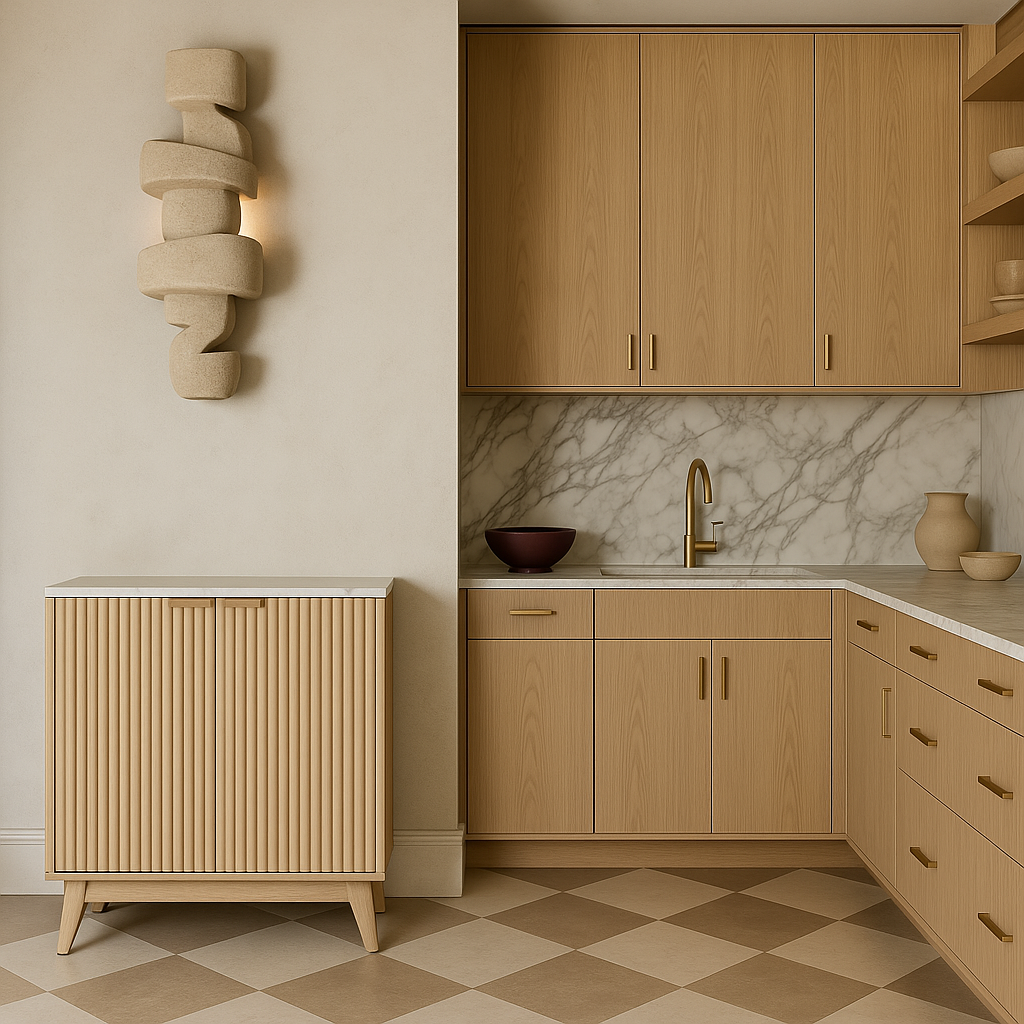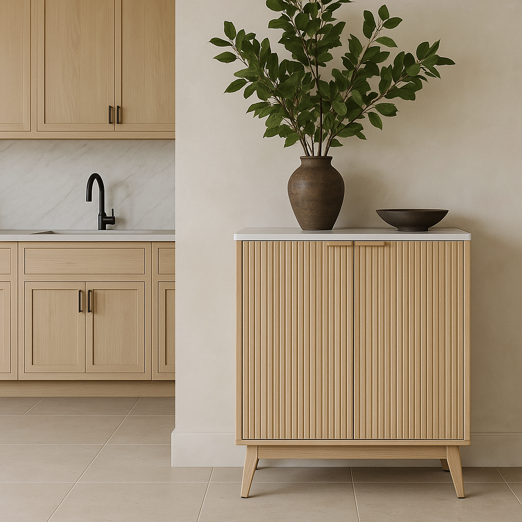 The QueenFun Cabinson Sideboard Buffet Cabinet is a masterpiece of modern farmhouse design, blending faux stone and natural oak finishes to create a warm yet sophisticated aesthetic. Its fluted panels and brass handles add a touch of luxury, while the adjustable shelves provide practical storage solutions. Style it in your dining room or living area, adorned with curated decor pieces, to transform your space into a haven of refined comfort.