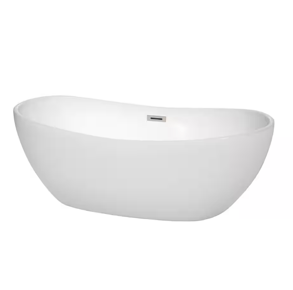 A sleek, oval freestanding tub designed for deep, relaxing soaks. Durable acrylic construction keeps water warmer and makes installation easier, while brushed nickel overflow/drain trim adds a refined touch.