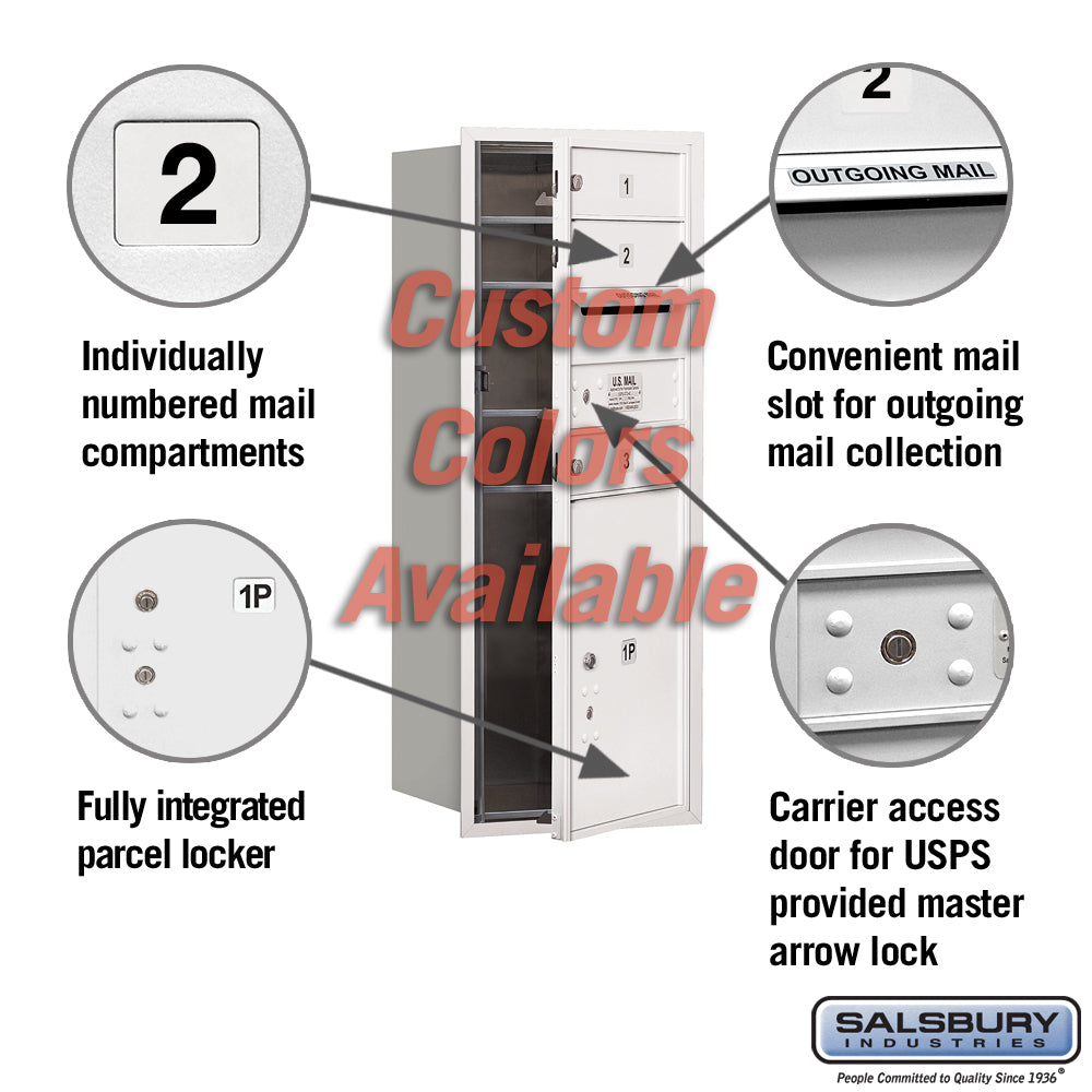 The Recessed Mounted 4C Horizontal Mailbox is a durable and USPS-approved solution for mail storage, featuring heavy-duty aluminum construction, a secure cam lock system, and a custom color finish. Ideal for residential and commercial use, it includes a parcel locker and outgoing mail compartment for convenience.