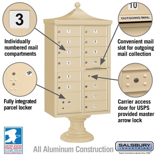 | Number of Doors | 13 mail compartments and 1 parcel locker |
