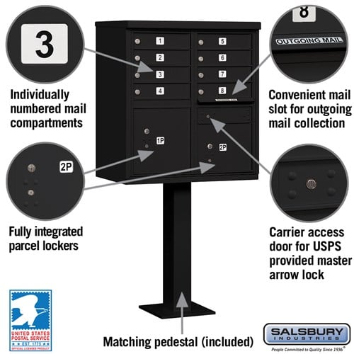The Cluster Box Unit with 8 Doors and 2 Parcel Lockers offers secure mail and package storage with USPS access. Constructed from heavy-duty aluminum and stainless steel, it features a durable powder-coated finish and integrated parcel lockers for added convenience.
