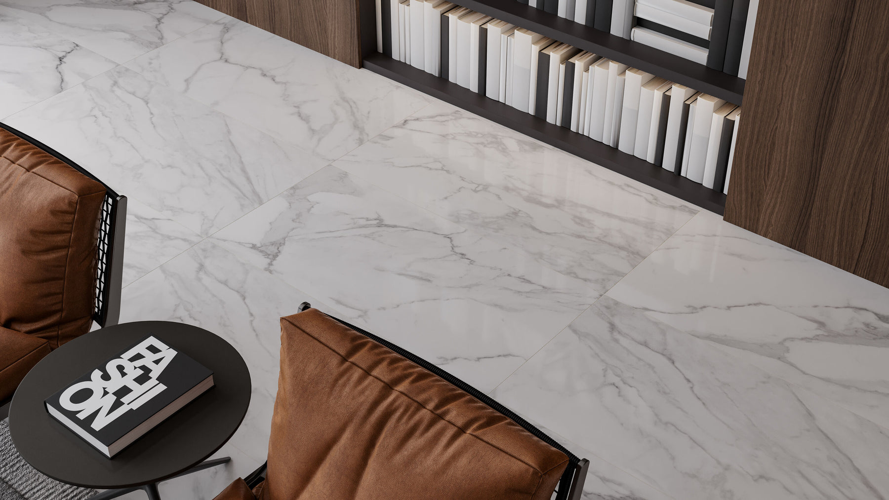 Large-format, polished porcelain tile delivering a luxe marble look for floors and walls. Rectified edges allow tight grout joints for a seamless, contemporary finish, while impervious porcelain offers lasting durability and easy maintenance.