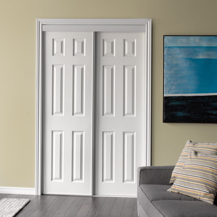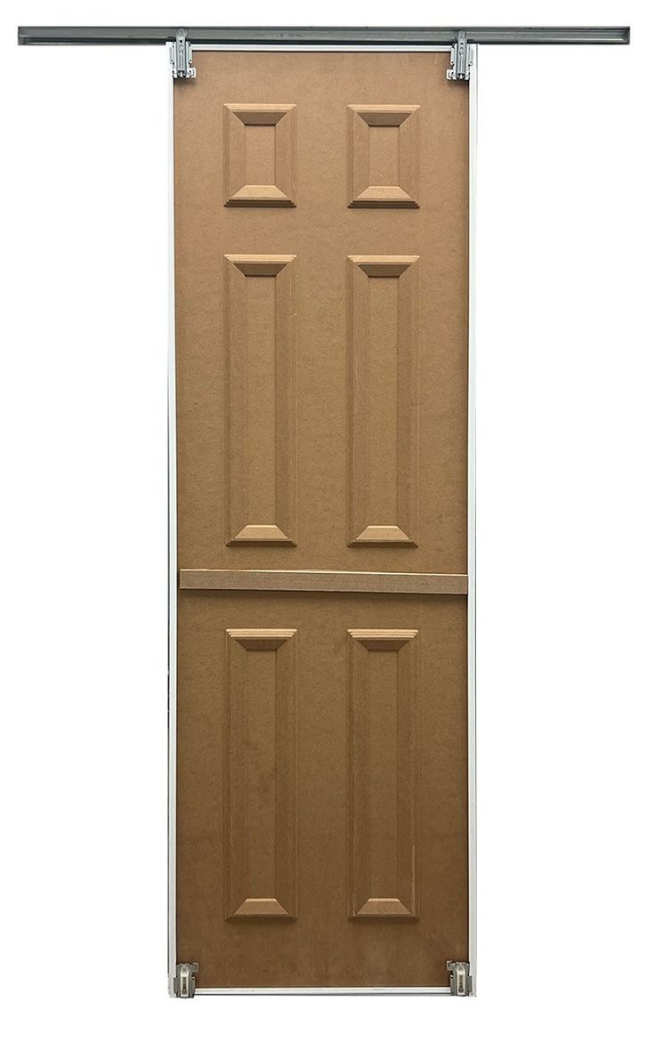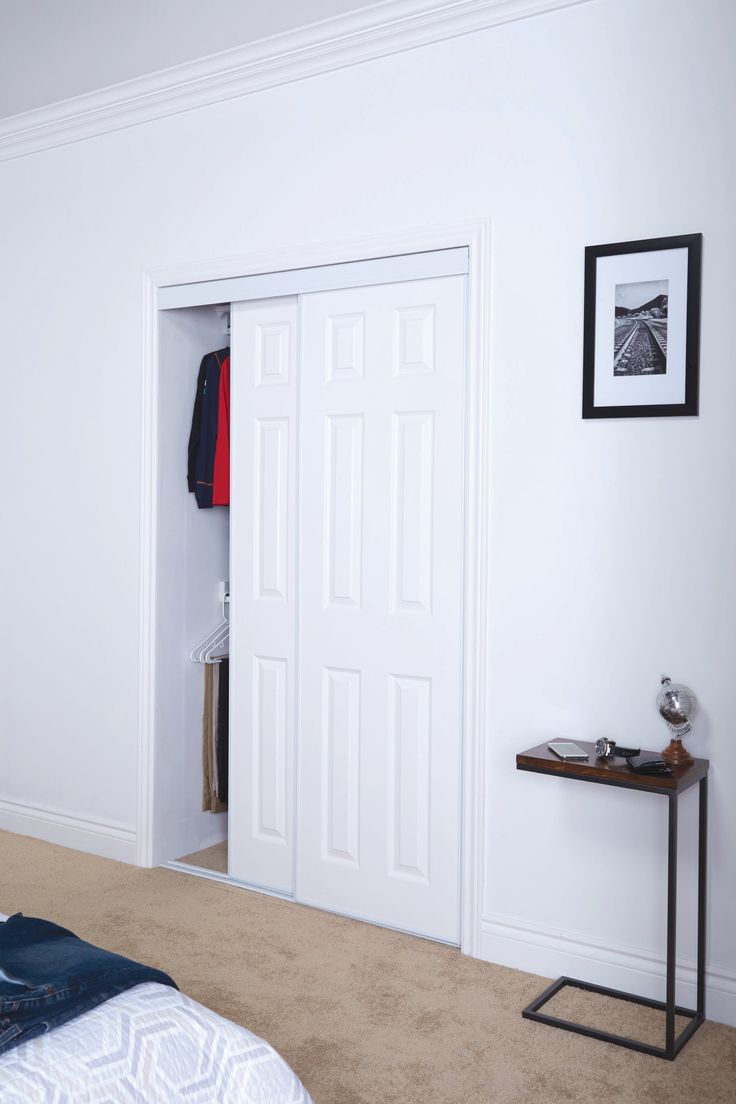 With the Easy-Hang sliding closet door hardware, your door can be quickly and easily installed onto its top roll sliding track system. The molded 6-panel design and slimline steel frame, complete with an integrated handle, are prefinished in a bright white color, eliminating the need for painting and clean-up. The Quick-Click Anti-Jump Connector and bottom guide ensure that the doors stay securely on the closet door track. The low-profile Invisi-Track system creates a hazard-free opening and allows for effortless cleaning and smooth sliding. Additionally, the adjustable Easy-Hang hardware can correct out-of-square door openings by up to 1/4 inch, improving both installation and appearance, which is particularly beneficial during renovations. Please note that custom sizes are not available due to the nature of the embossed panel, and the back side of the panels are left unpainted.