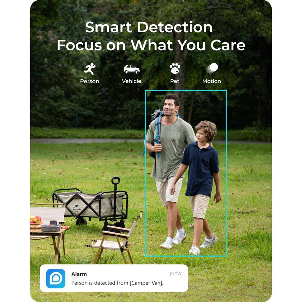 - Smart Detection Alerts: Intelligently distinguishes between people, vehicles, and pets to reduce false alarms.