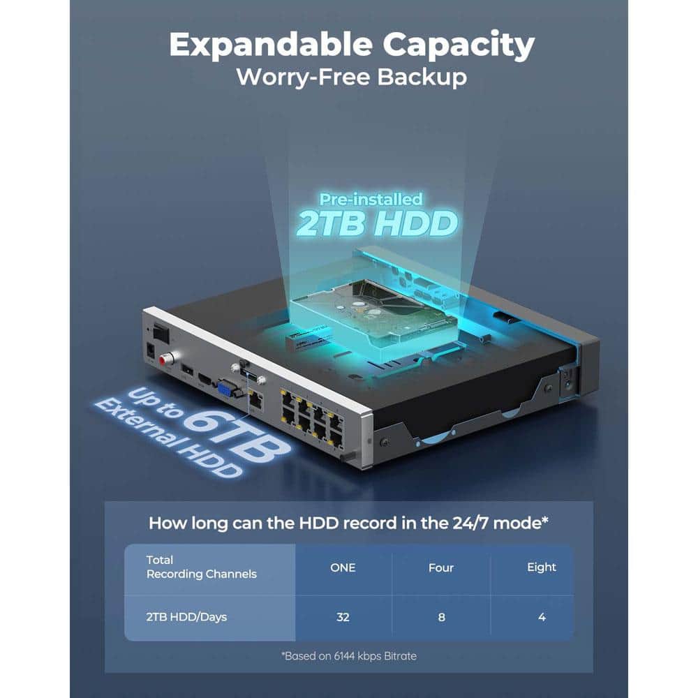24/7 Recording: Equipped with a 2TB hard drive, expandable to 12TB for extensive video storage.