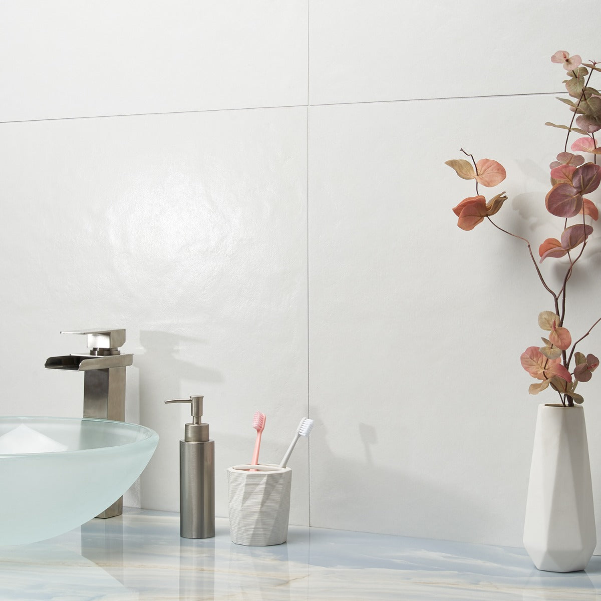 The Rethink Plaster White Matte Porcelain Tile offers a sophisticated leather-like texture and a semi-polished matte finish. Its large format minimizes grout lines, creating a seamless and elegant look for both residential and commercial spaces.