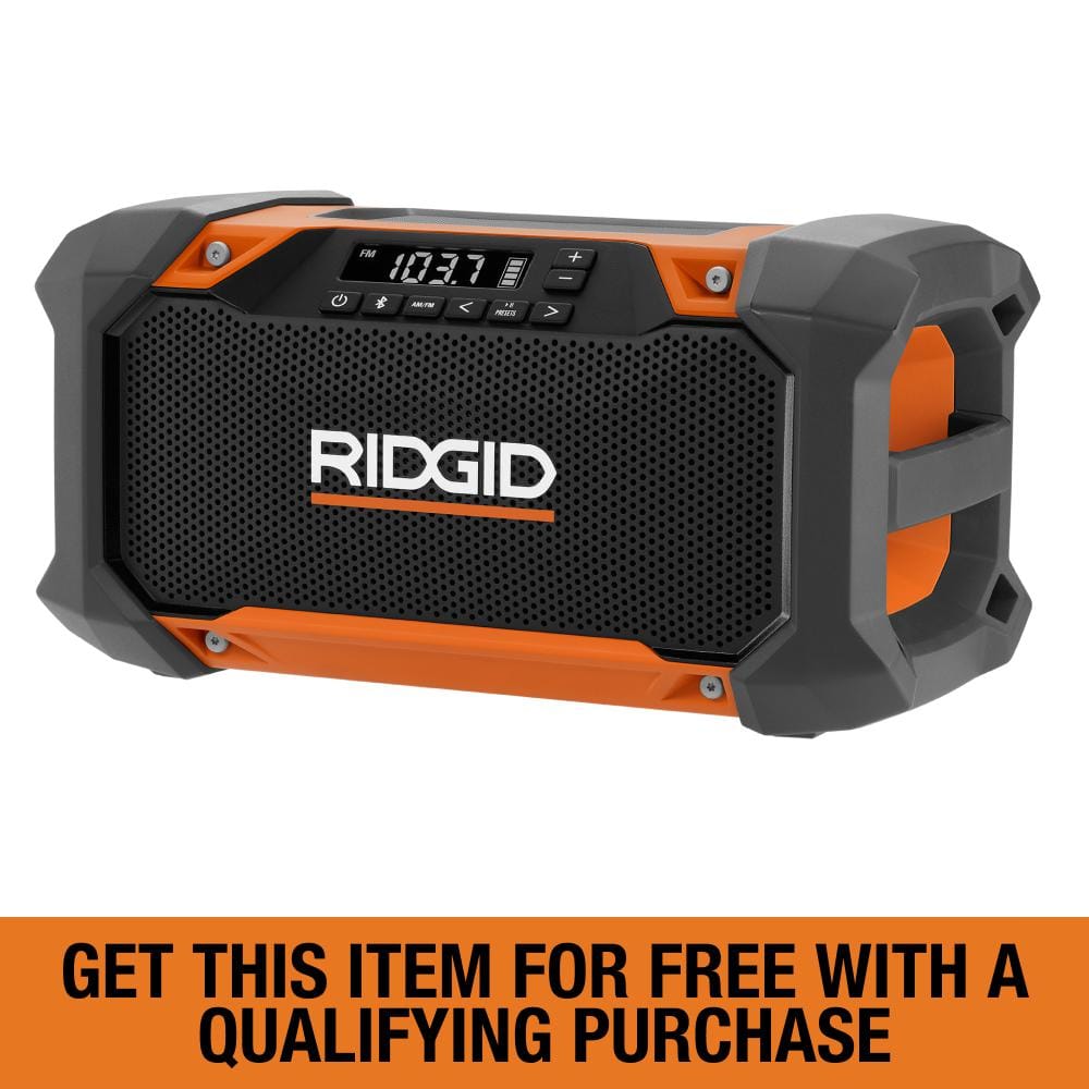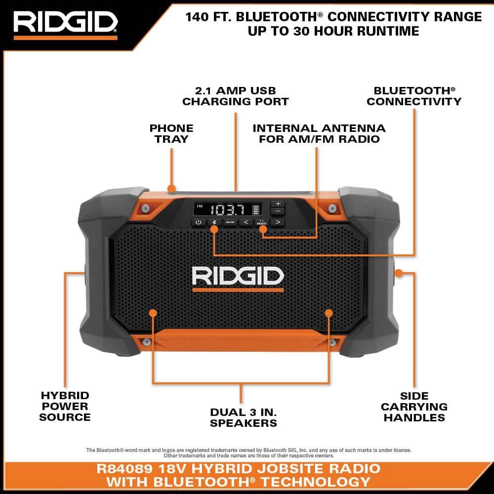 Enhance your worksite experience with the RIDGID 18V Hybrid Jobsite Radio. Designed for ultimate versatility, it offers exceptional sound quality and Bluetooth connectivity up to 140 feet. With options for AC/DC power and long battery life, this radio ensures your tunes keep up with your workday.