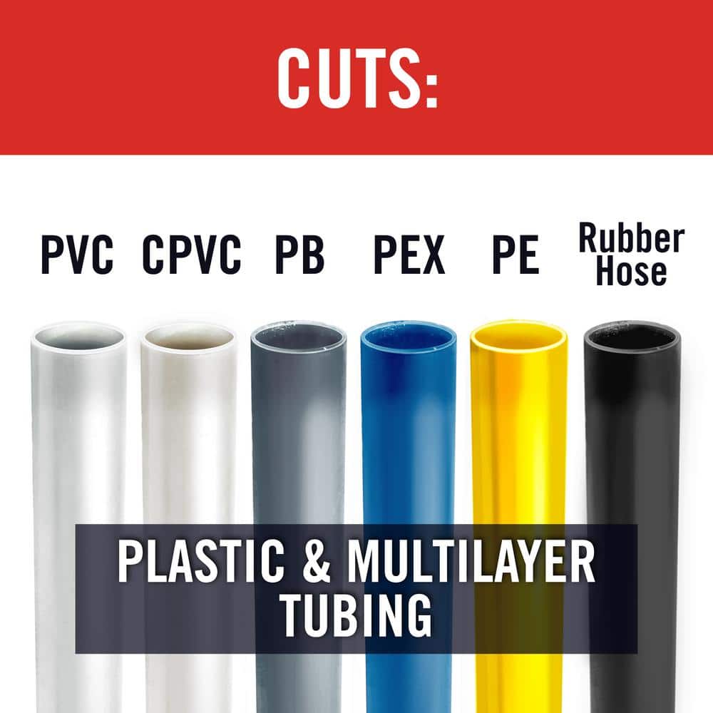 Q: What materials can this cutter handle? A: PVC, CPVC, PB, PEX, PE, multilayer tubing, and rubber hose.