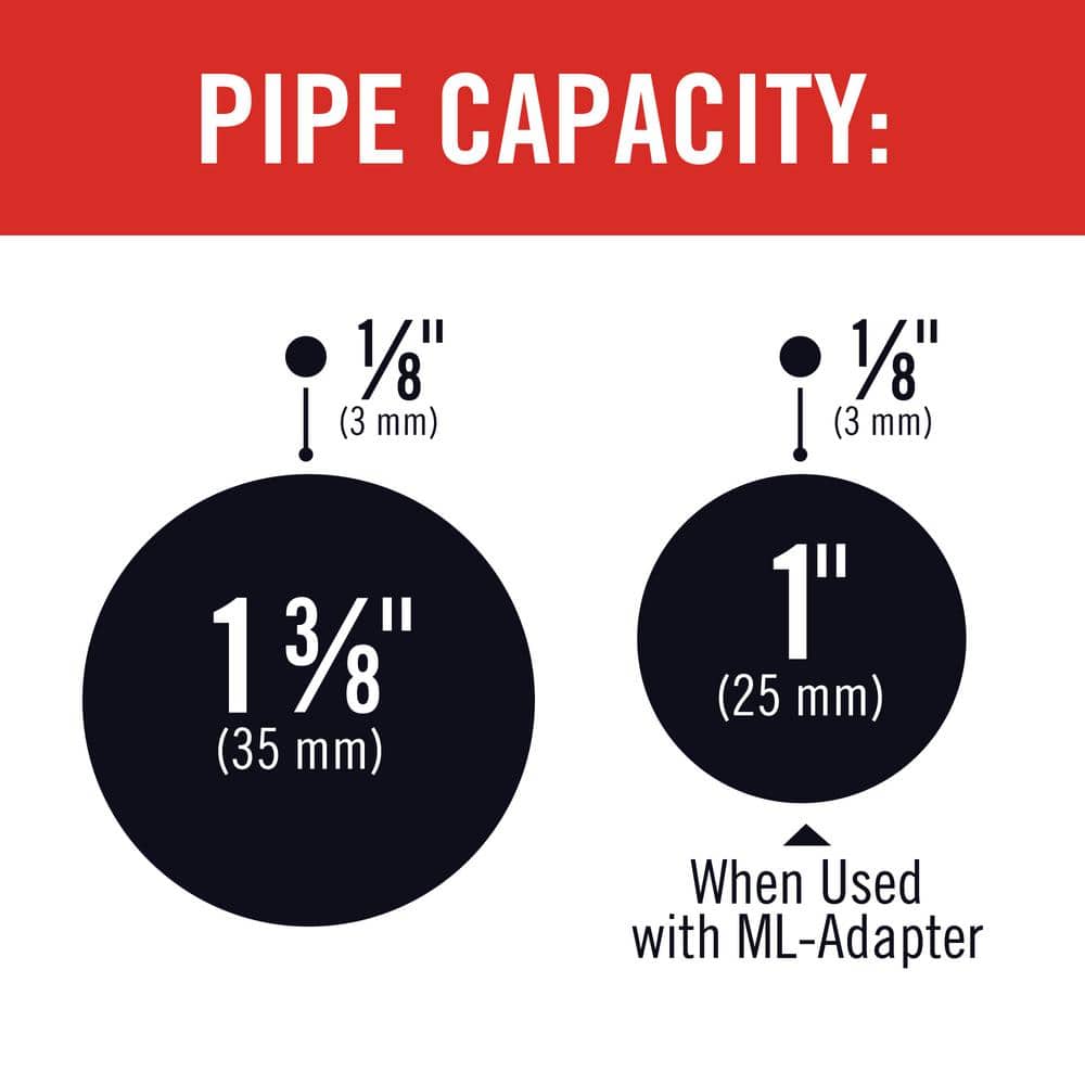 Q: What is the cutting capacity? A: 1/8 in. to 1-3/8 in. outer diameter; up to 1 in. when using the ML adapter.