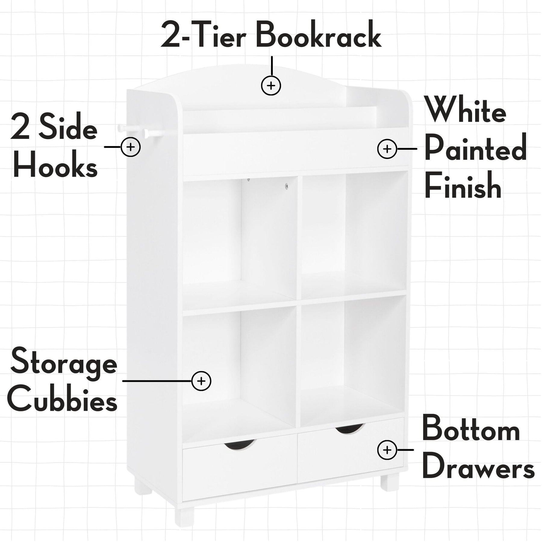 - Ample Storage: Features four cubbies, a two-slot bookrack, two drawers, and side hooks for hanging.