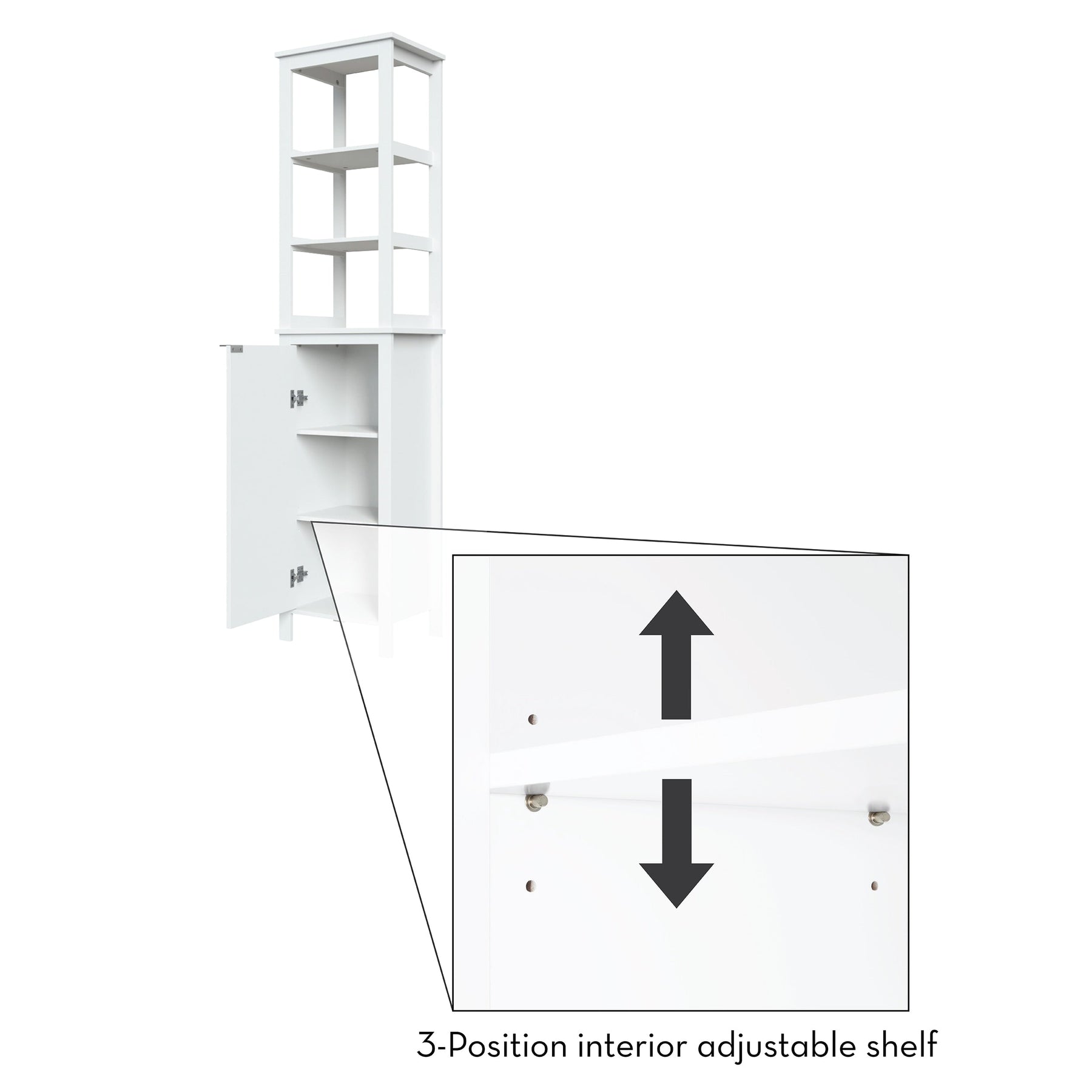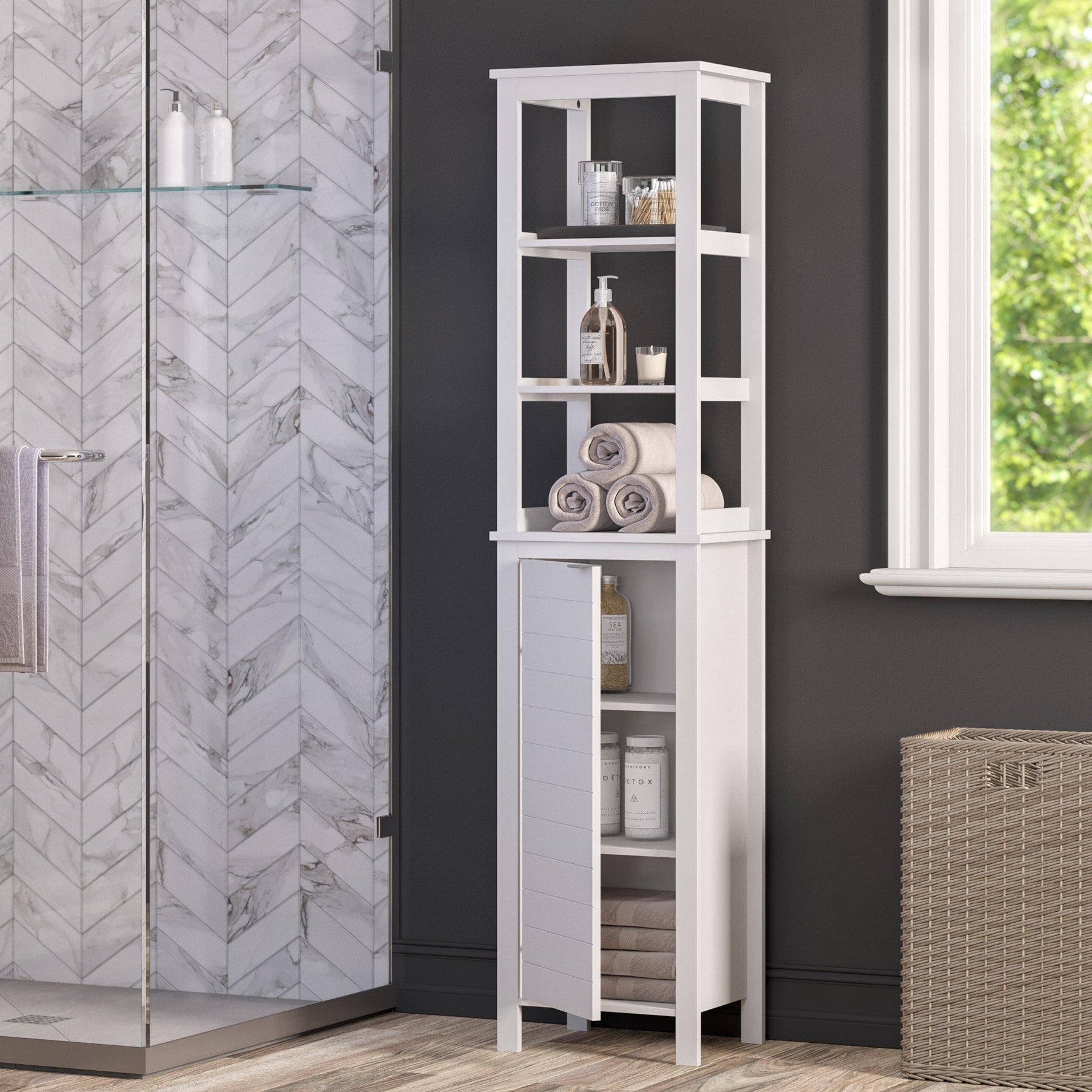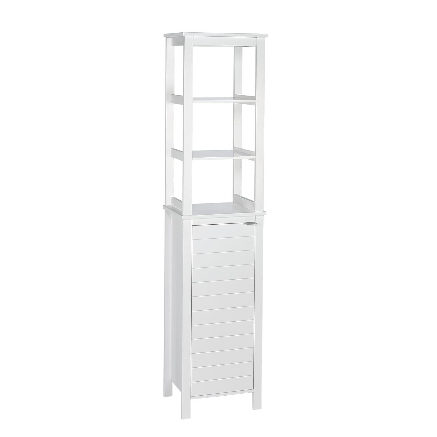 Transform your bathroom or laundry space with the RiverRidge Madison Linen Cabinet, designed for class and efficiency. This tall, narrow cabinet features open shelving for display and a bottom cabinet door to neatly conceal your essentials. Its durable MDF construction ensures lasting quality, while the painted white finish adds a sleek and timeless appeal.
