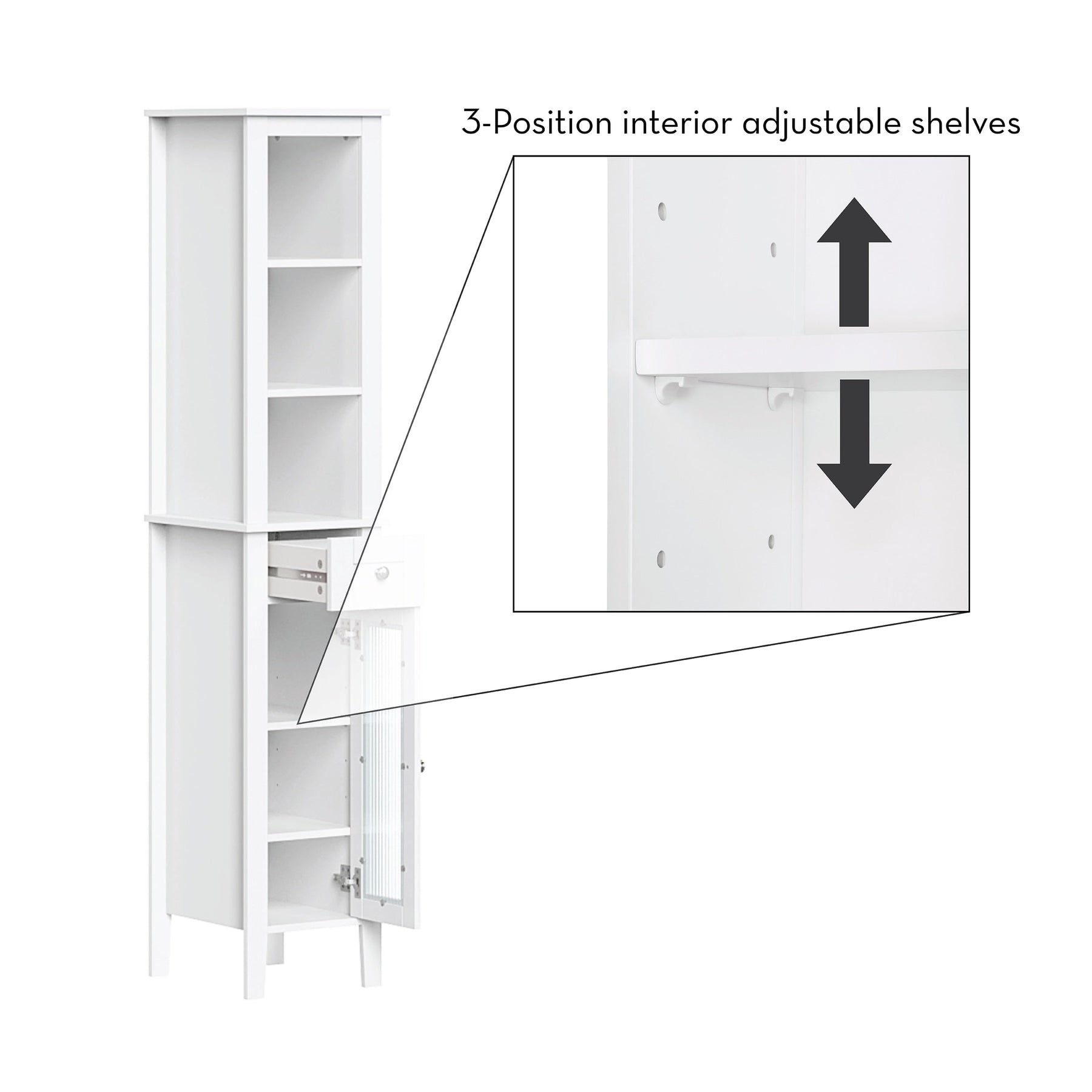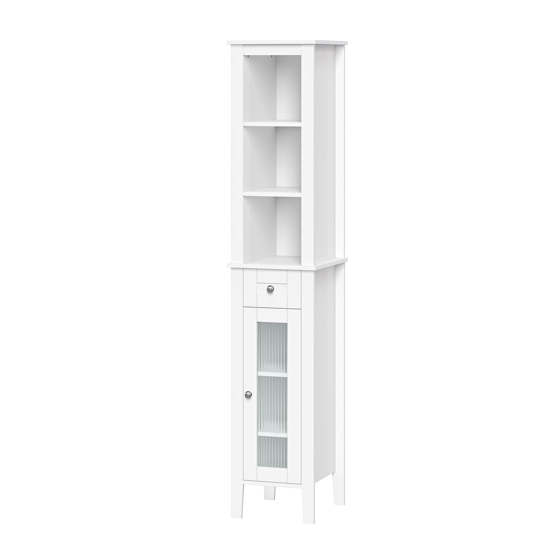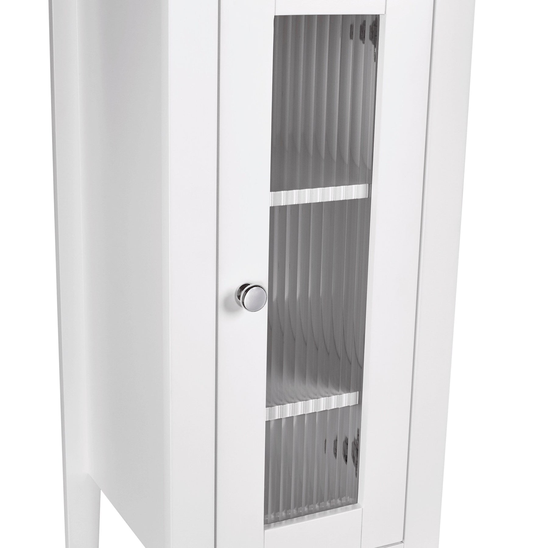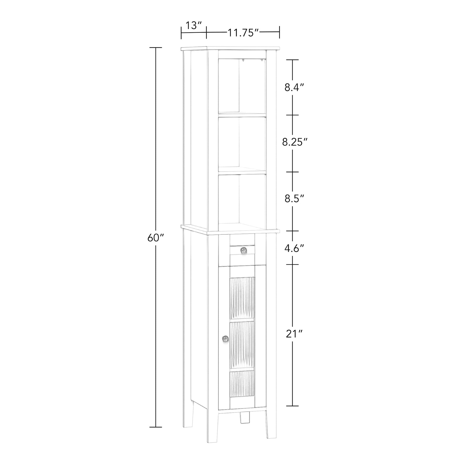 The RiverRidge Prescott Linen Cabinet offers a stylish and space-efficient solution for organizing your bathroom essentials. Standing at 60 inches tall, this narrow cabinet fits seamlessly into tight spaces, boasting a contemporary design with elegant reeded glass doors and soft-close hinges.
