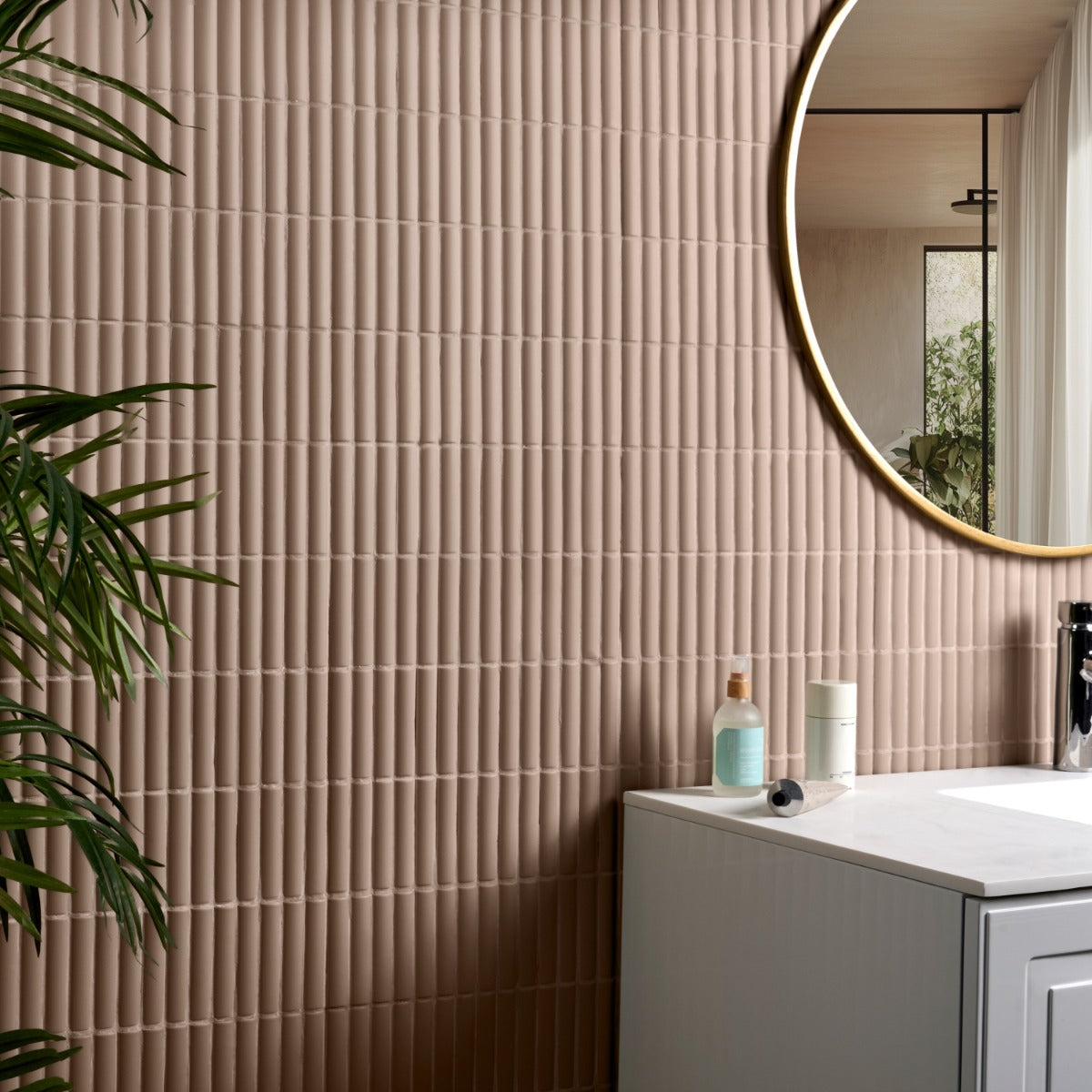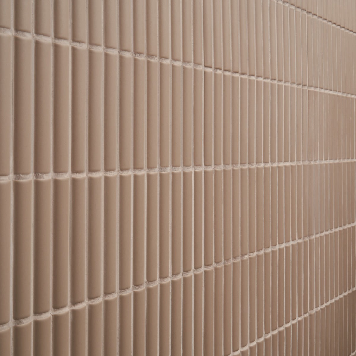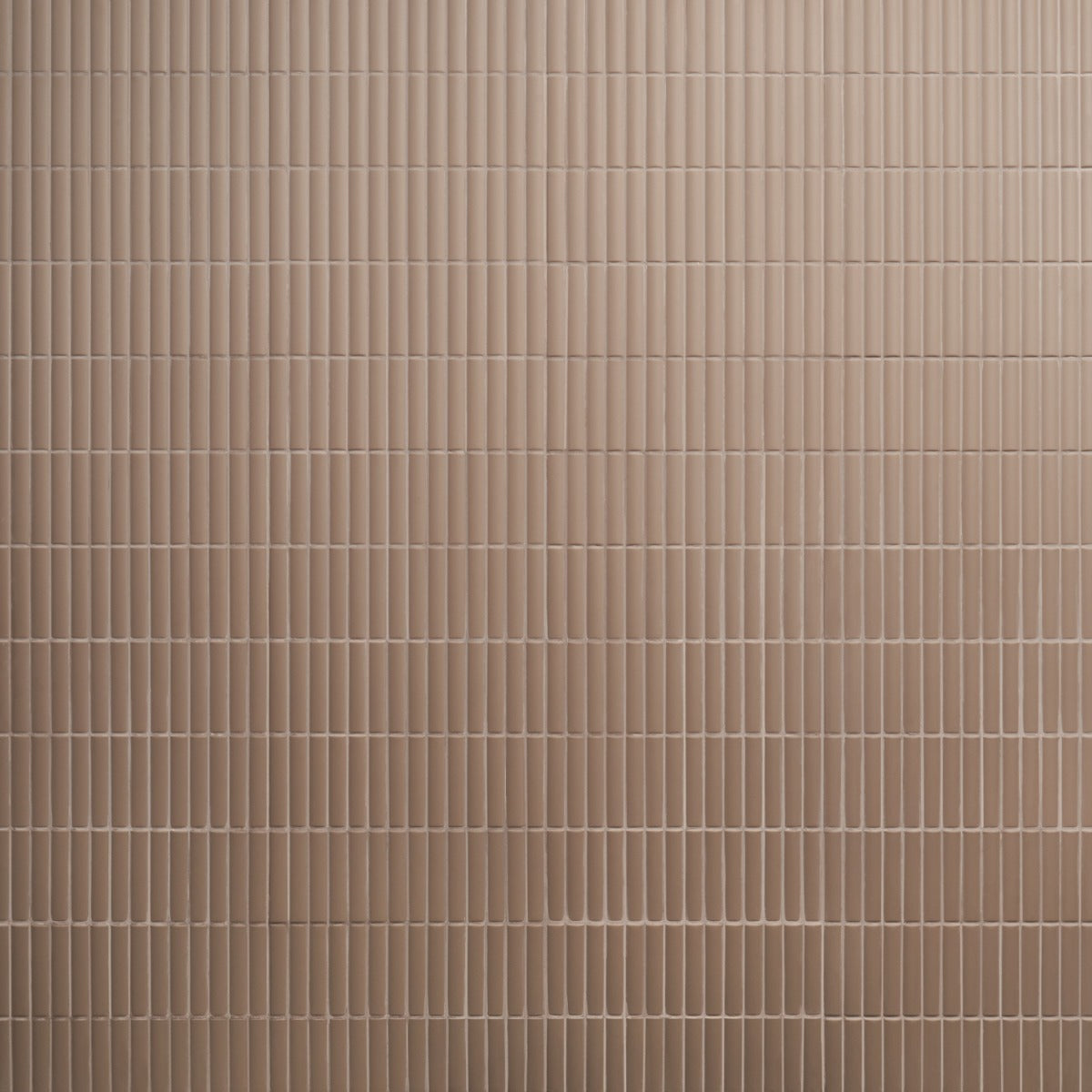 The Roller Ribbed Taupe Ceramic Tile features a 3D ribbed surface in a warm taupe color, perfect for creating modern and tactile wall designs. Made in Spain, this eco-friendly tile combines durability with a matte finish for a sophisticated look.