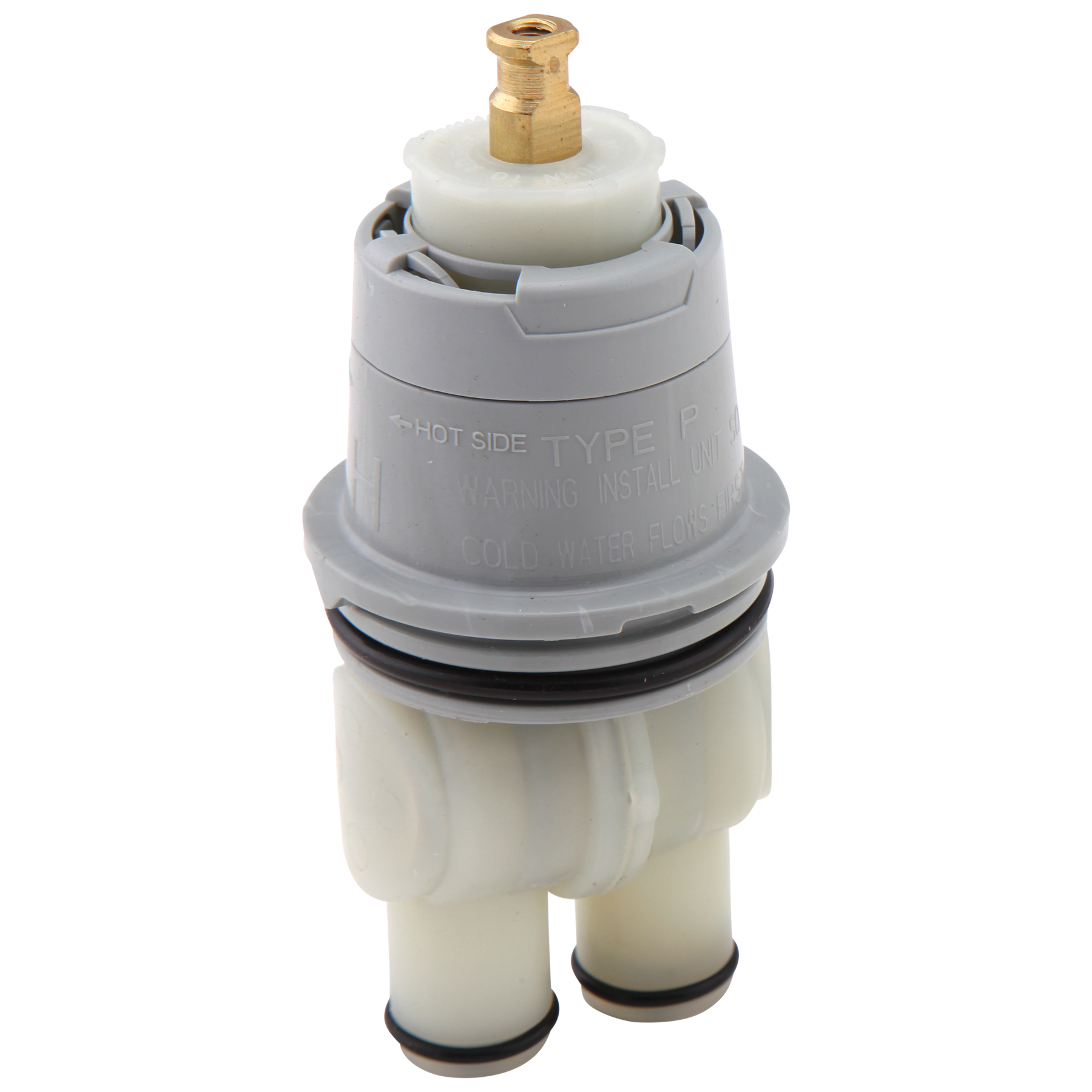Replacement cartridge assembly for Delta MultiChoice 13/14 Series tub and shower valves produced after March 2006. Monitor single-function pressure balance technology helps maintain a consistent water temperature, with an integrated rotational limit stop for adjustable max-hot control.
