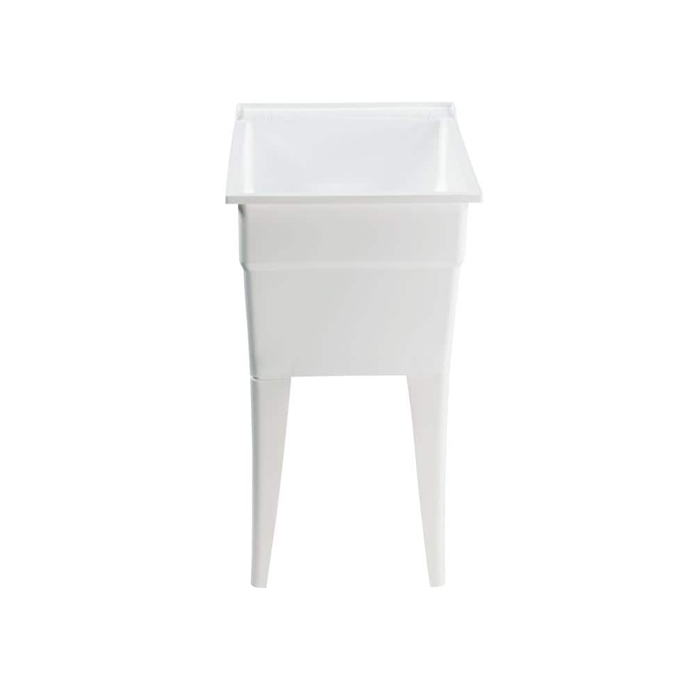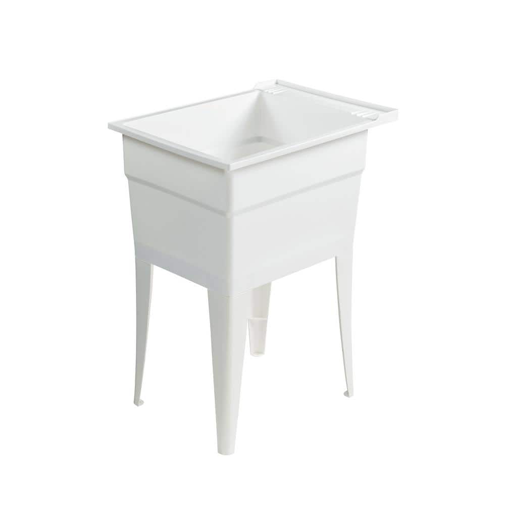 Upgrade your home or garage with the RUGGED TUB 18 x 24-inch Freestanding White Utility Laundry Sink. Designed for versatility, this heavy-duty sink features integrated soap dishes and non-rust adjustable feet. Perfect for tight spaces, it provides durability and flexibility for various settings.