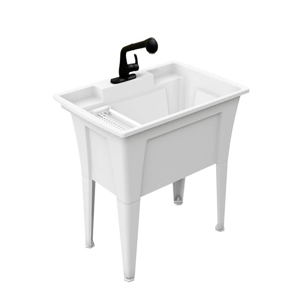 The RUGGED TUB 32" Freestanding Utility Sink is a versatile addition to any workspace, whether it be laundry, garage, or utility room. Featuring a durable construction with 100% virgin polypropylene, it includes a stylish black pullout faucet and a complete installation kit. Its robust design serves both form and function, ensuring long-lasting durability and ease of assembly.