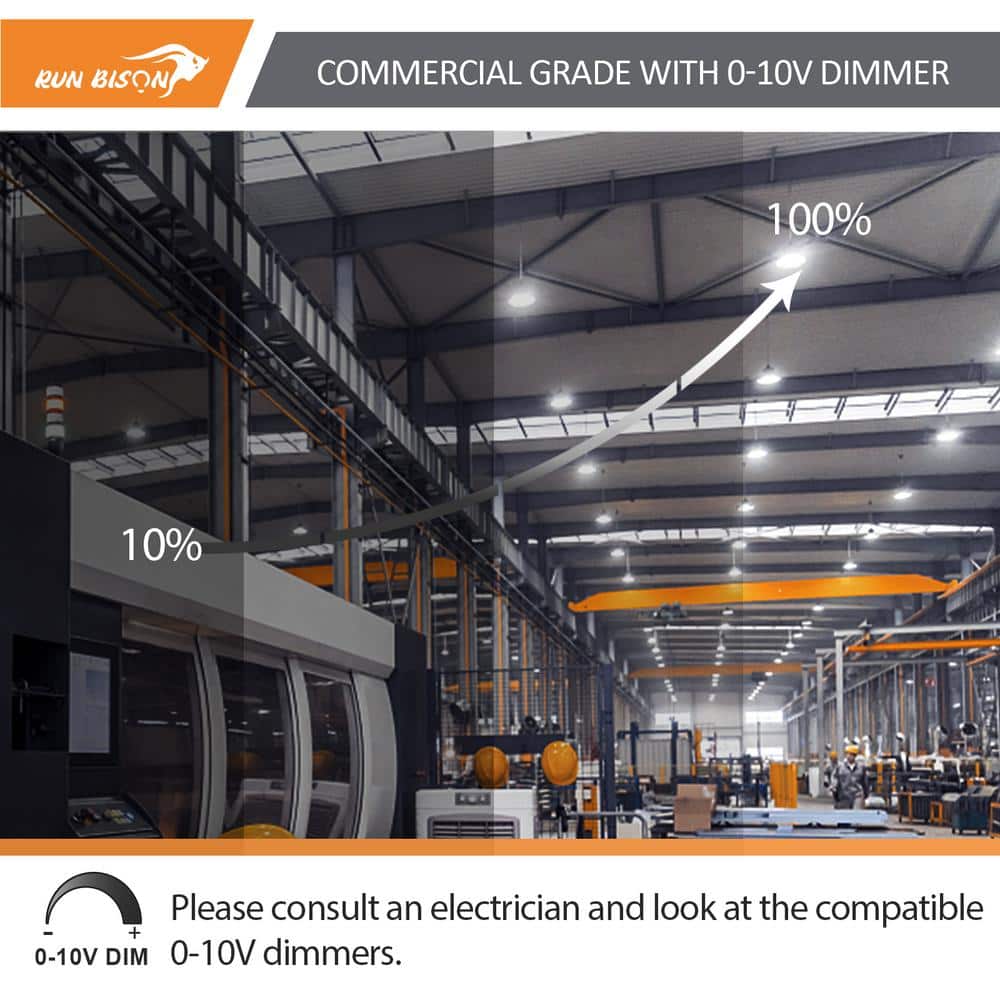 Illuminate large spaces with the RUN BISON UFO LED High Bay Light, offering powerful brightness with up to 21,000 lumens. Ideal for commercial environments, this lighting system is energy-efficient and features versatile dimming capabilities, making it perfect for warehouses, gyms, and garages.