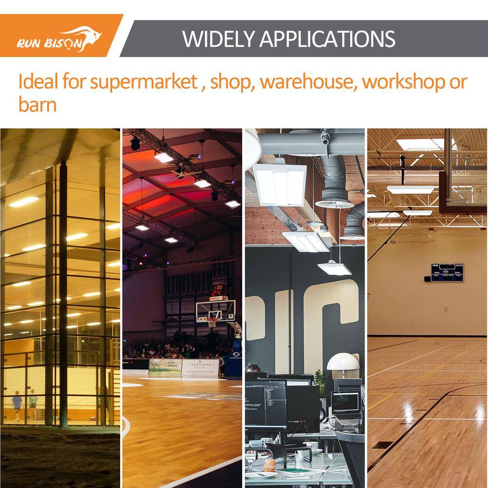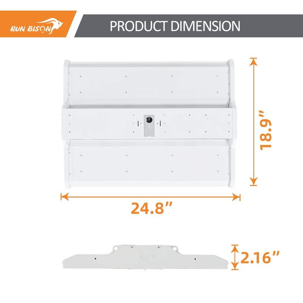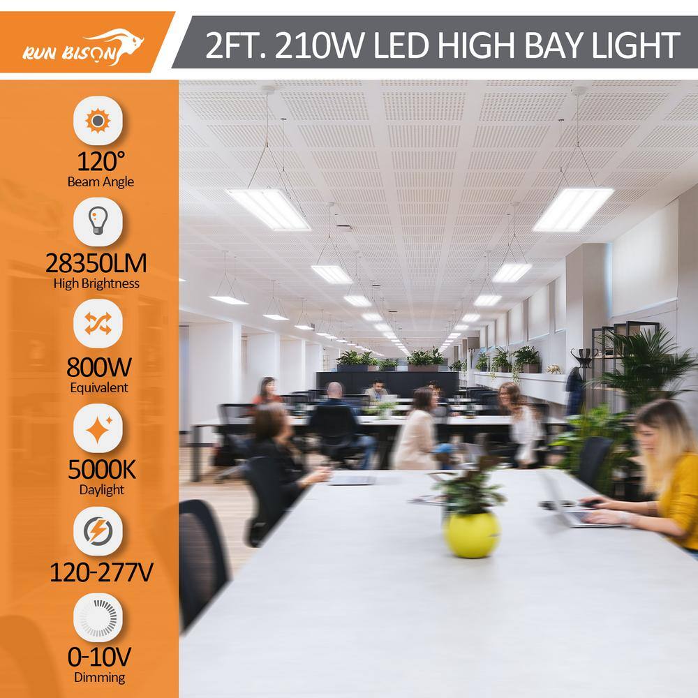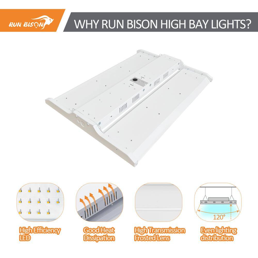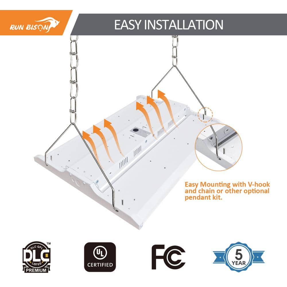 Illuminate your space efficiently with the RUN BISON 2 ft. LED Linear High Bay Light. This high-performance lighting solution delivers 28,350 lumens while using just 210 watts, perfect for commercial settings like warehouses, workshops, and retail spaces. Experience up to 60% energy savings over traditional lighting and benefit from its long-lasting, mercury-free operation.