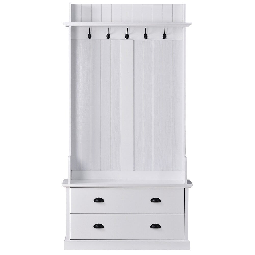 Versatile Storage: Features five hooks and two large drawers for convenient storage of everyday items like coats and hats.