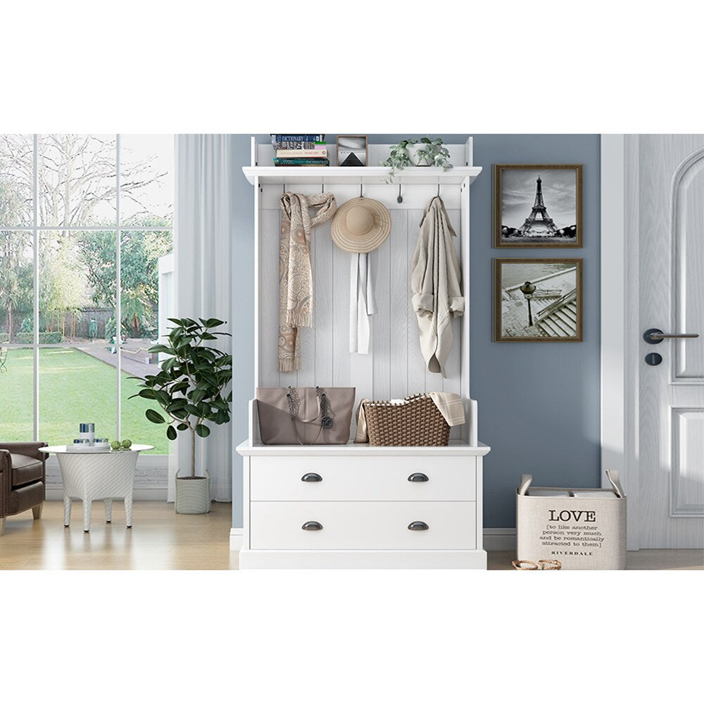 The Runesay Farmhouse Hall Tree offers a charming blend of functionality and vintage style for your home. Crafted from durable composite wood, this 38.5-inch hall tree is perfect for organizing your entryway with its multiple hooks, spacious drawers, and elegant white finish.
