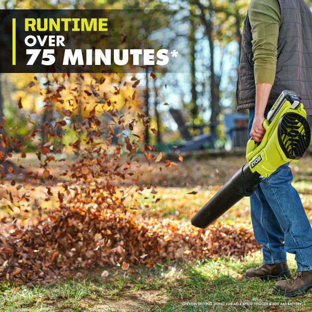 Q: Does this blower work with other RYOBI batteries? A: Yes, the blower is part of the RYOBI 40V system, meaning it's compatible with any 40V RYOBI battery.