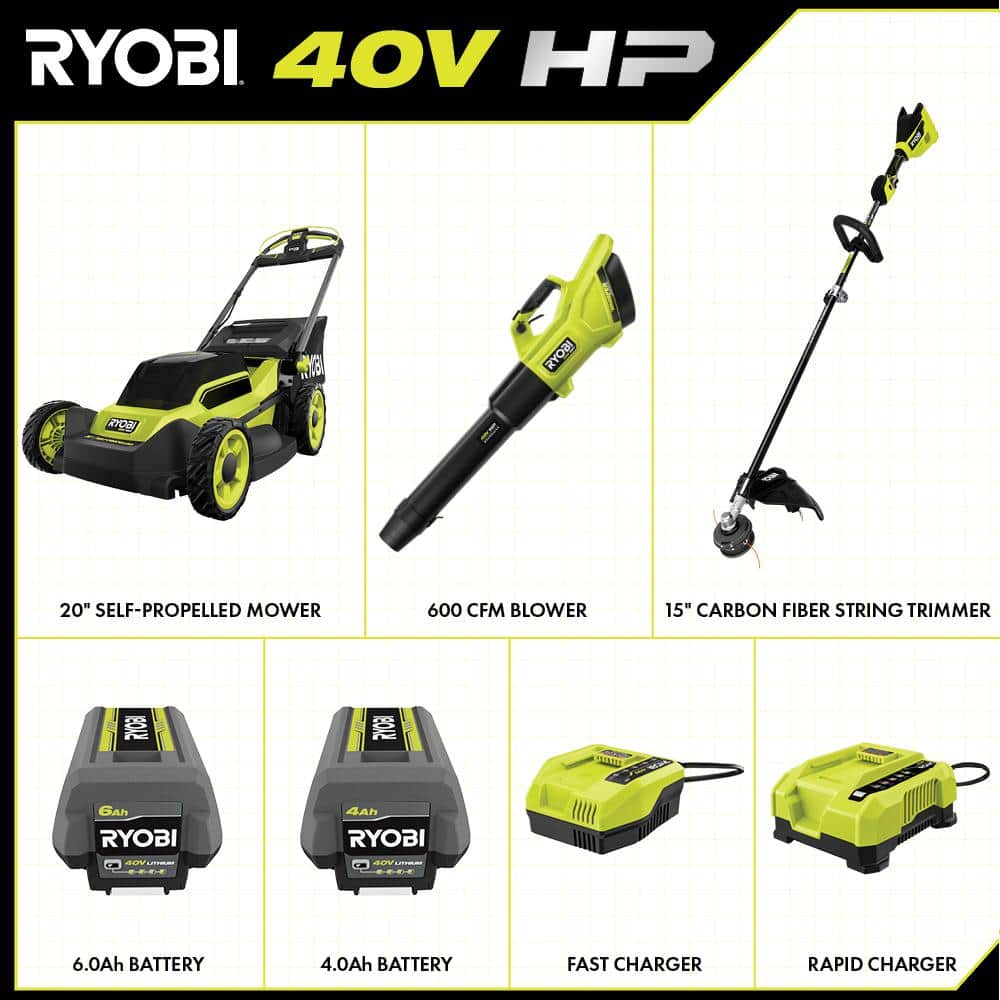 The RYOBI 40V Cordless Mower, Trimmer & Blower Kit offers powerful, efficient yard work with gas-like performance minus the noise and maintenance. Featuring a robust 40V lithium battery system, this kit includes a self-propelled 20-inch mower, a Whisper Series blower, and a versatile string trimmer with Expand-It attachments.
