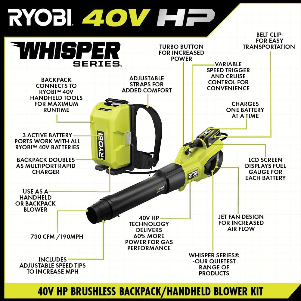 Q: Can I use the backpack battery with other RYOBI tools? A: Yes, the backpack battery system is compatible with all RYOBI 40V tools, expanding versatility and runtime.