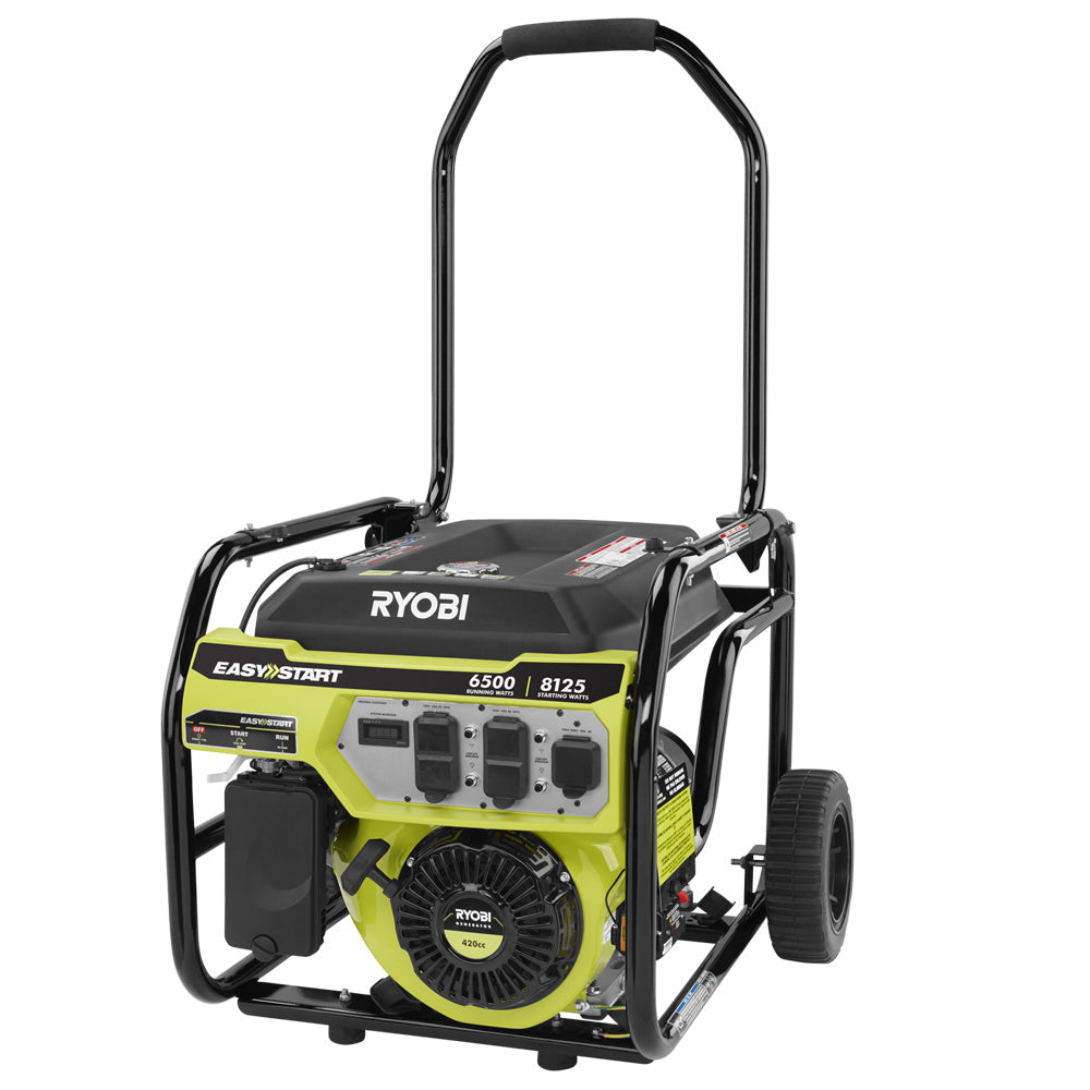 This RYOBI portable generator delivers 6,500 running watts (8,125 starting watts) to power essentials during outages, jobsites, or outdoor events. Gas-powered with Easy Start and integrated CO shutdown safety, it features multiple GFCI outlets and a rugged wheel-and-handle frame for transport.