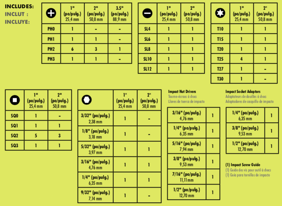 | Star (Torx) Bits | T10: (1) 1 in.; T15: (1) 1 in.; T20: (1) 1 in.; T25: (4) 1 in., (1) 2 in.; T27: (1) 1 in.; T30: (1) 1 in. |