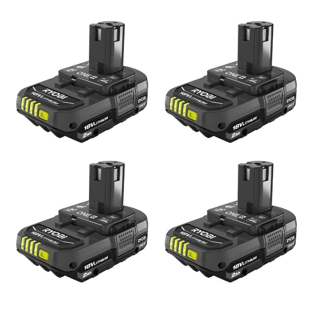 The RYOBI ONE+ 18V Lithium-Ion 2.0 Ah Compact Battery 4-Pack delivers superior performance with up to 1.5X more runtime than standard models, powering over 300 compatible tools. These compact batteries offer fade-free power, even in extreme conditions, and feature convenient charge indicators.